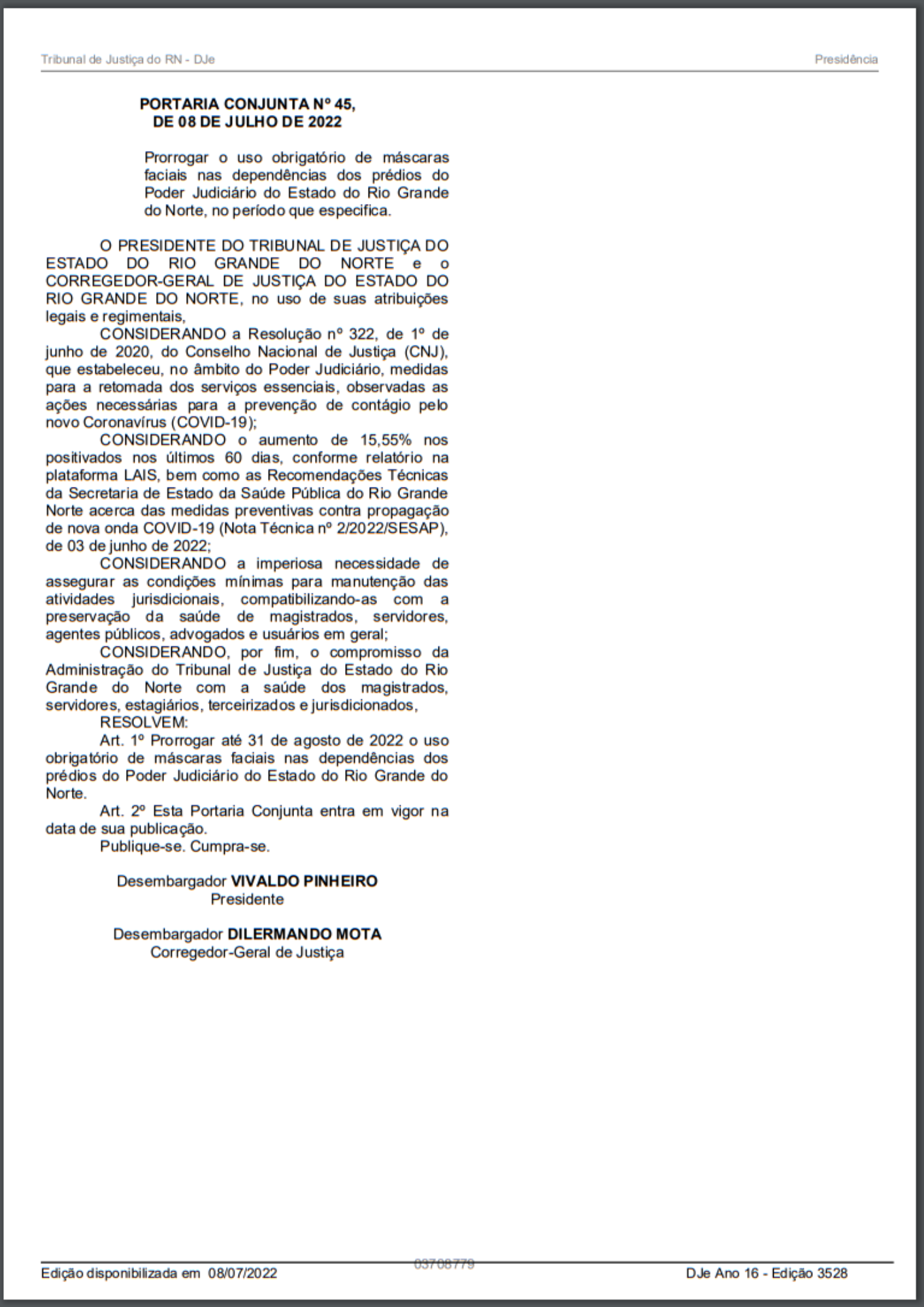 TJRN prorroga obrigatoriedade do uso de máscaras