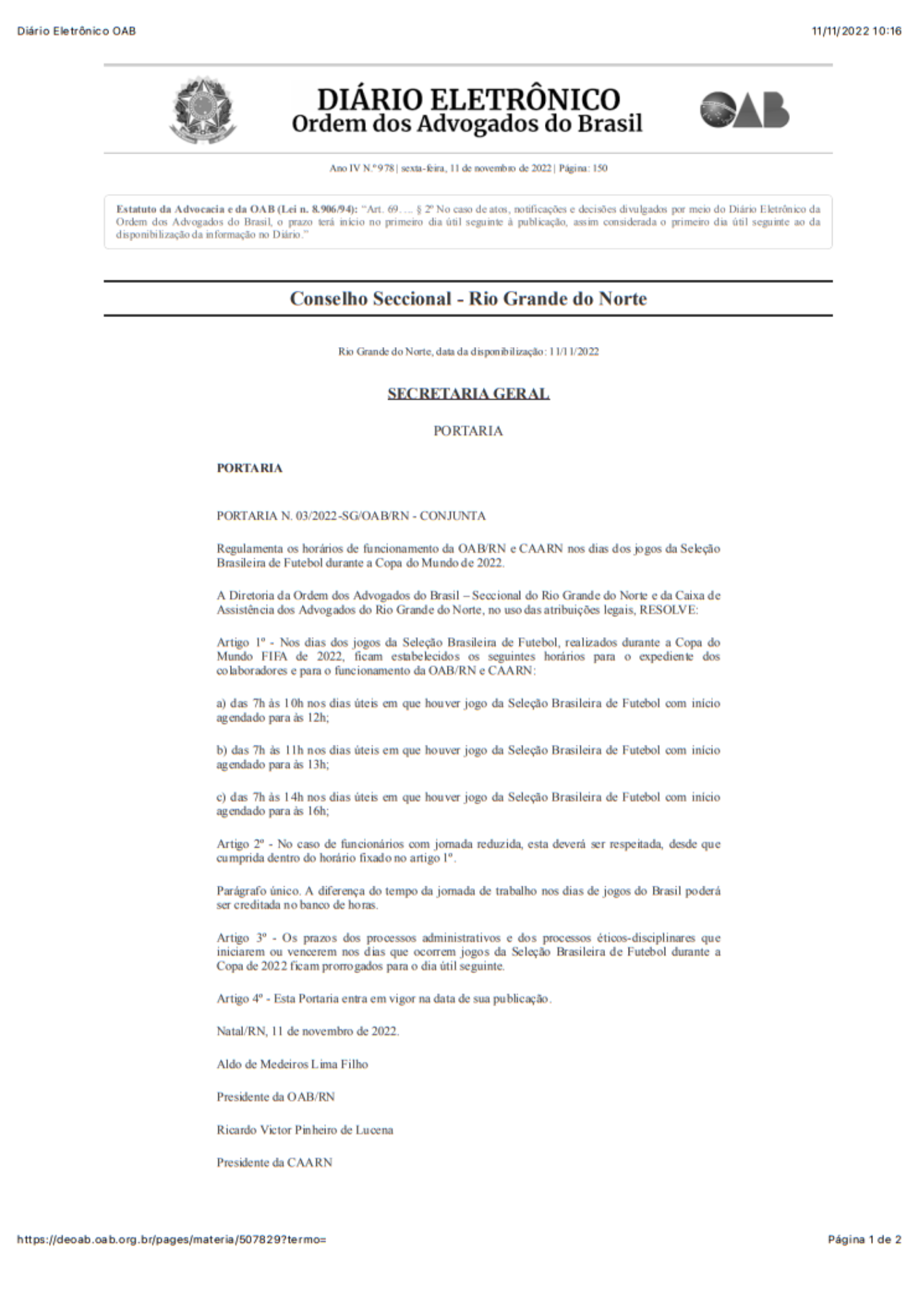Horário de funcionamento da OAB Mossoró durante jogos da selação brasileira