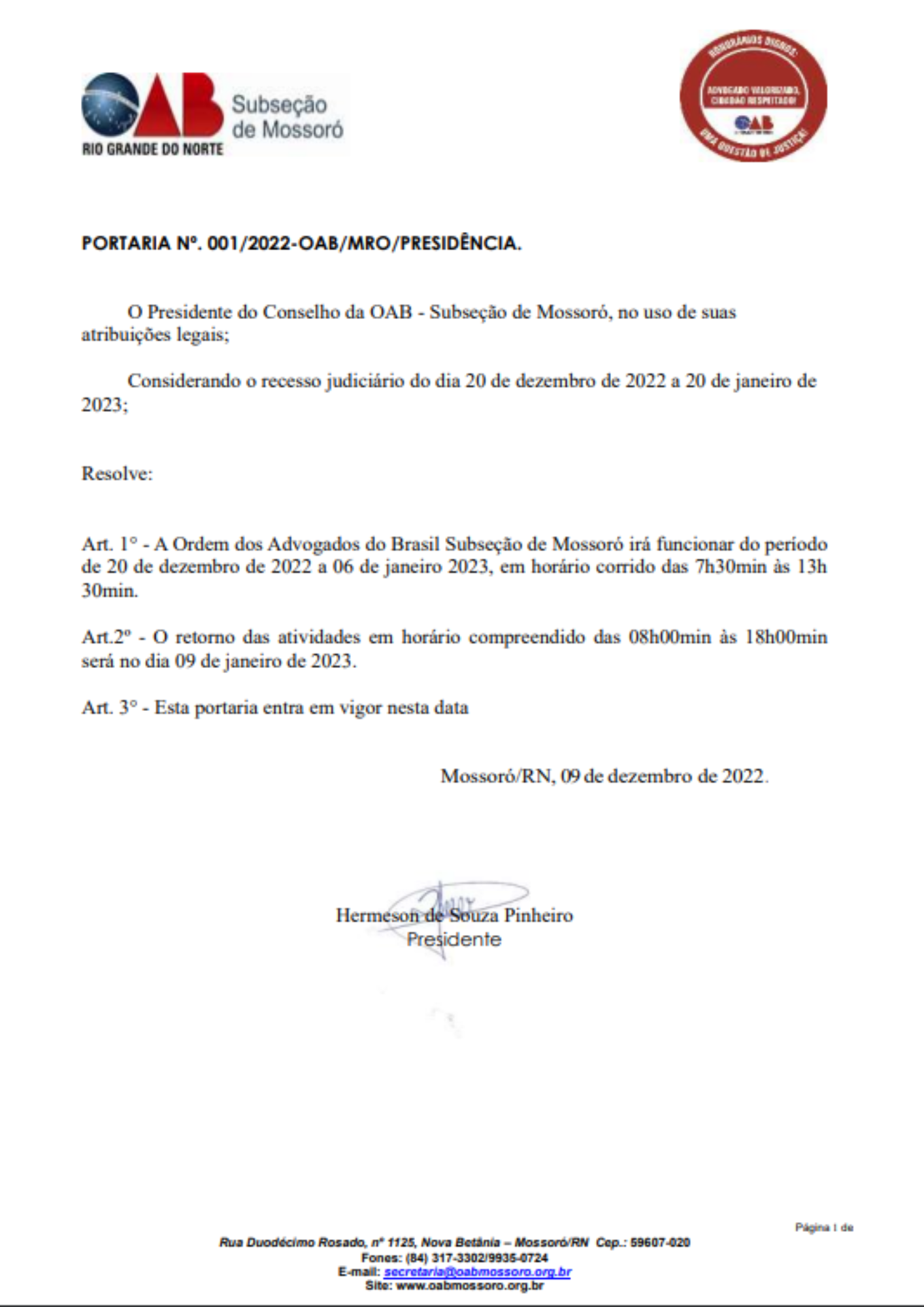 Expediente na OAB Mossoró de 20/12/22 a 06/01/23