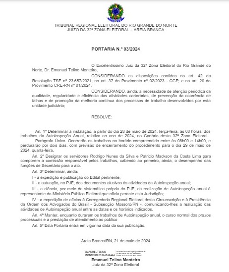 Autoinspeção Anual no Cartório da 32ª Zona Eleitoral - 28 e 29/05