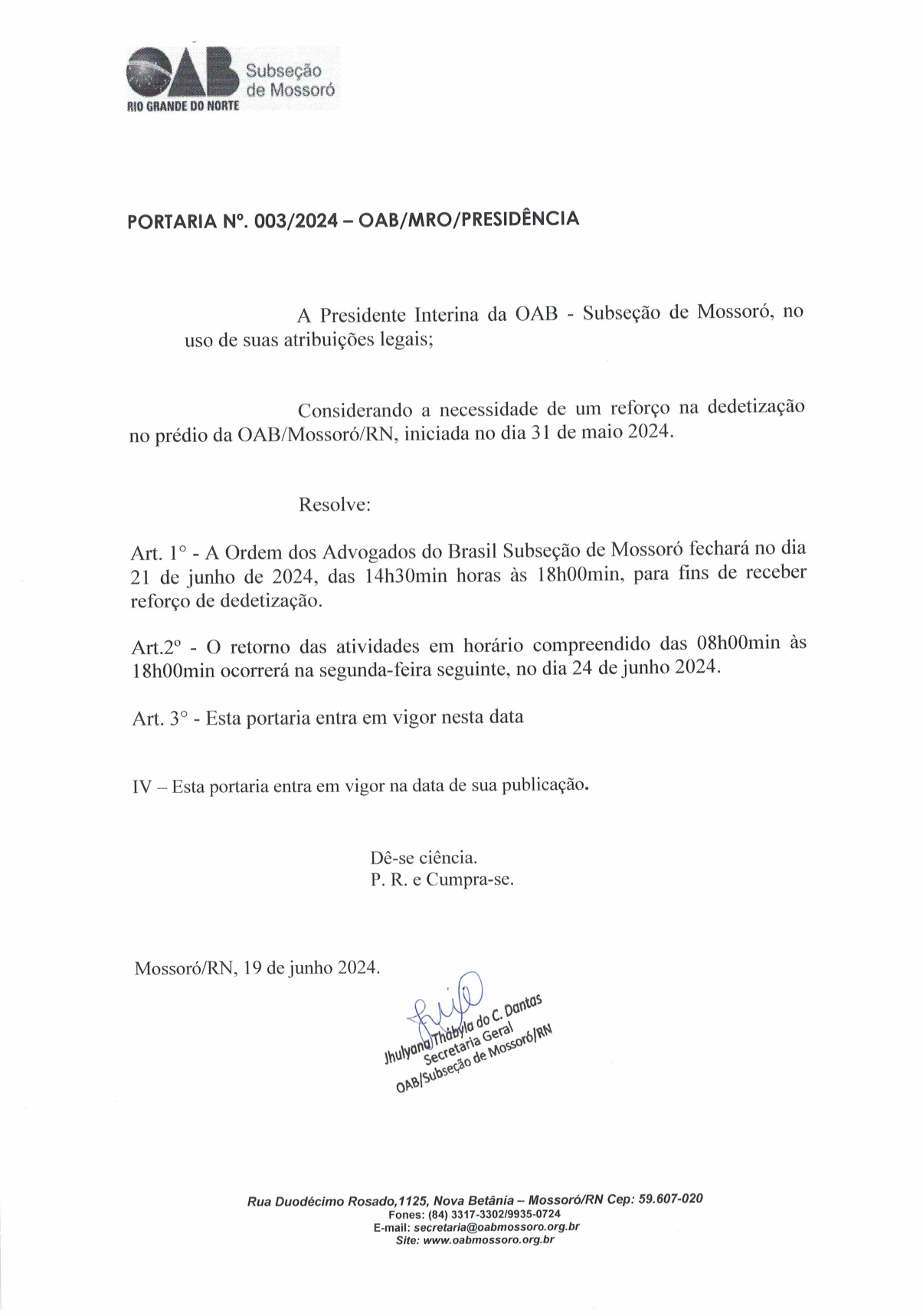 Portaria Nº 003/2024 - Expediente na Sede OAB Mossoró 21/04/2024
