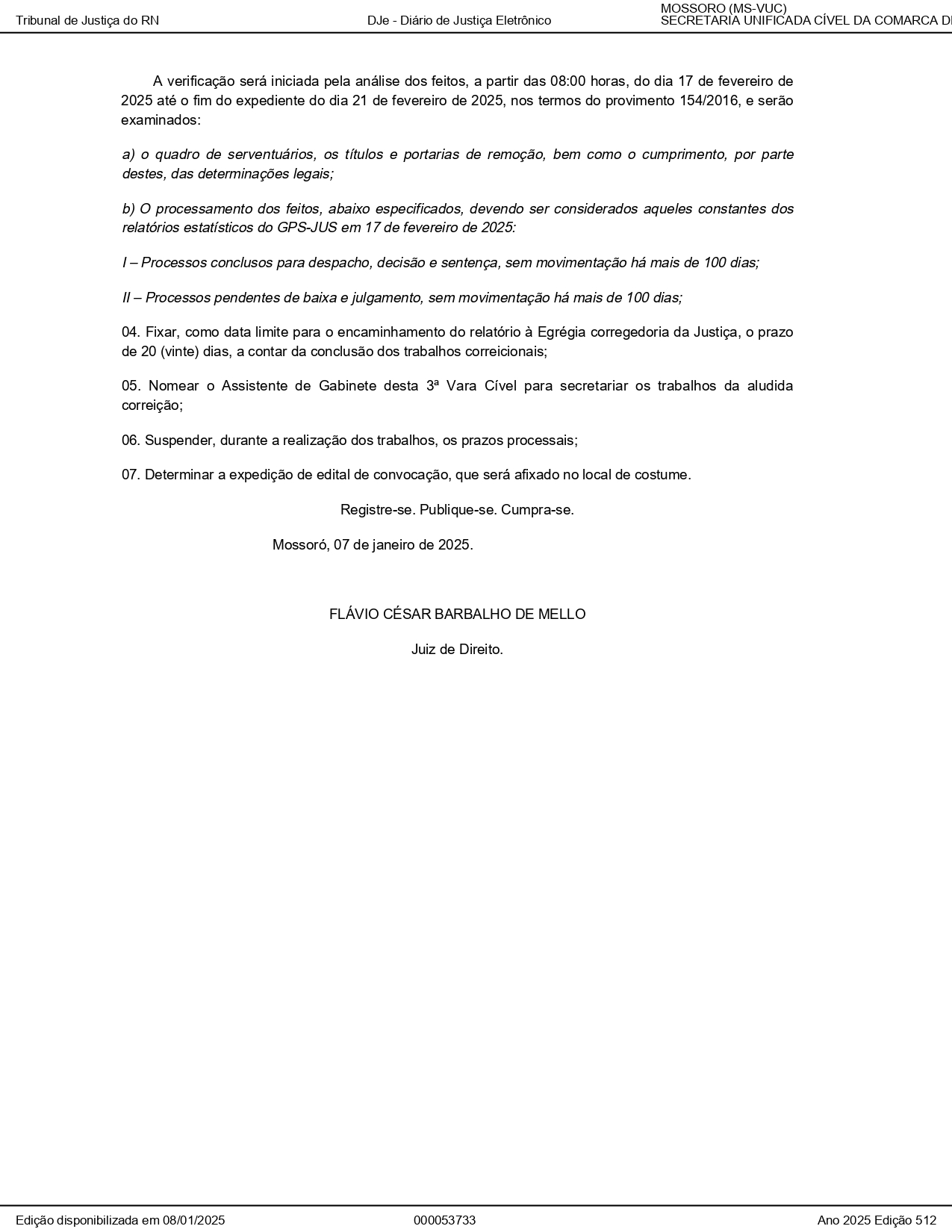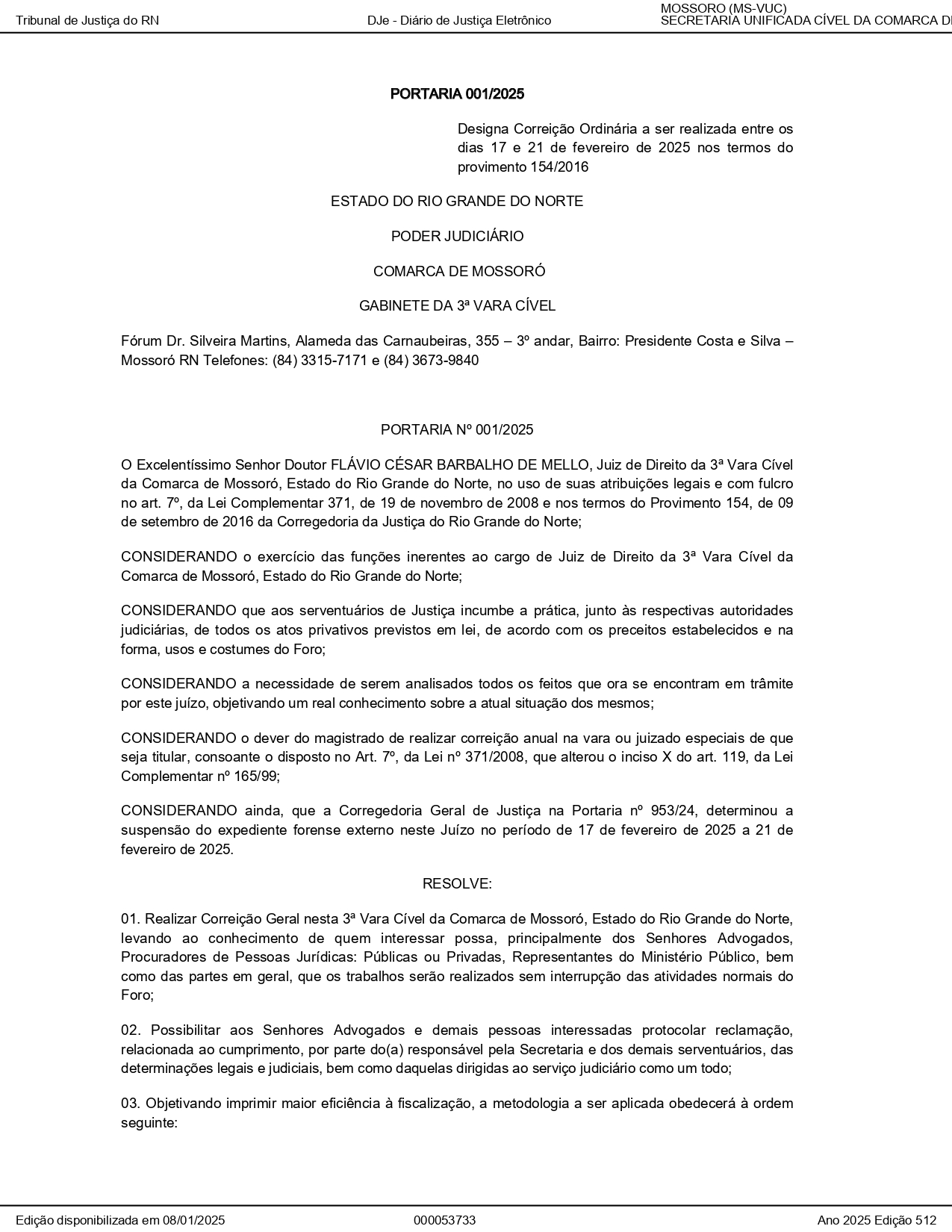 PORTARIA TJRN - PARA CORREIÇÃO NA 3 VARA CÍVEL DE MOSSORÓ