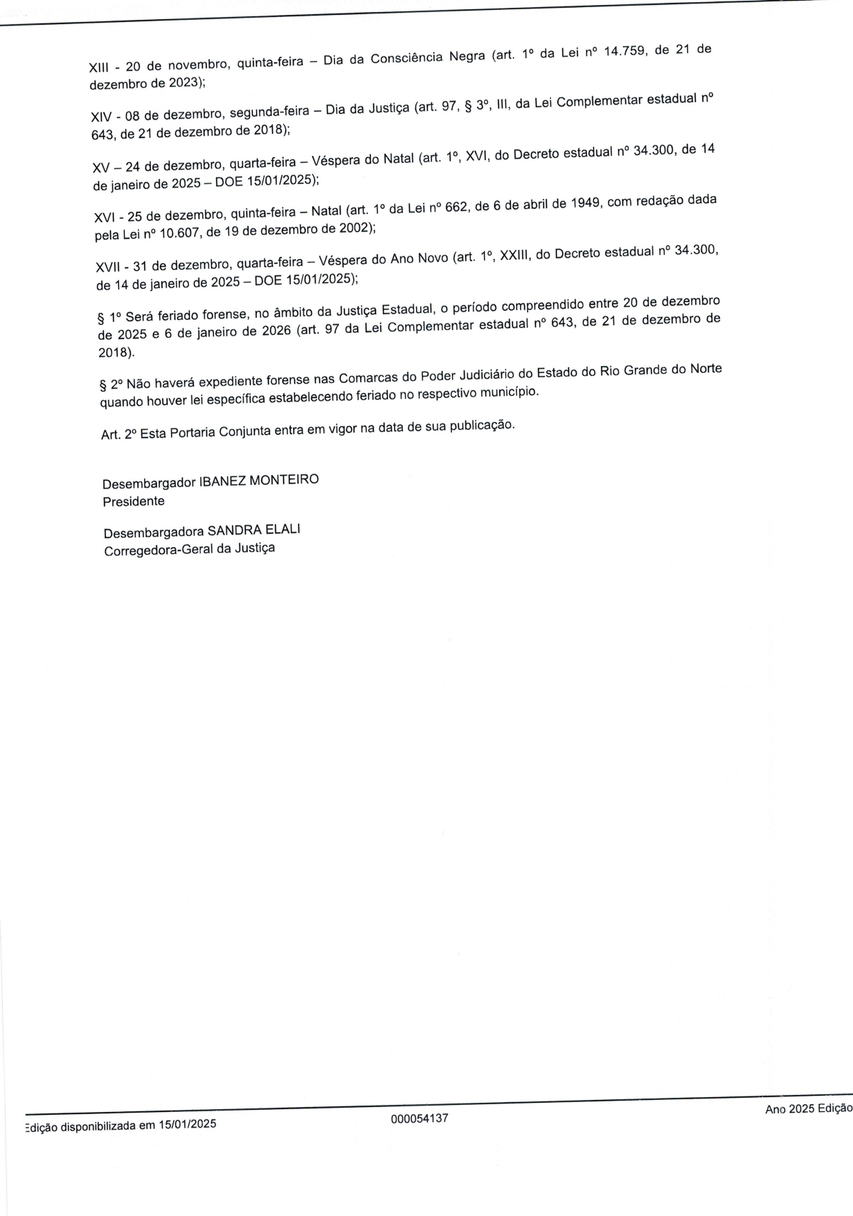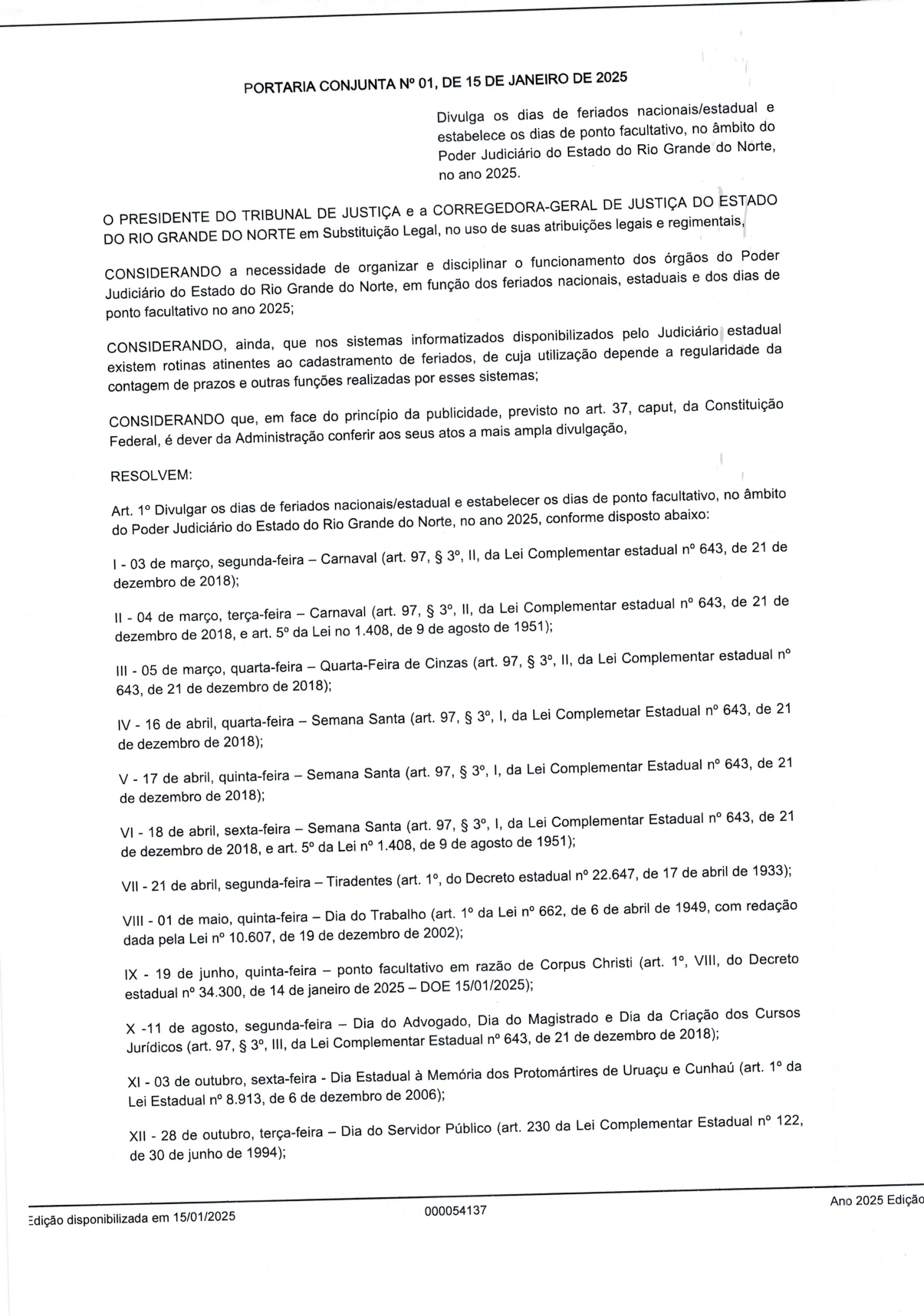 Portaria Conjunta Nº 01 de 15 de Janeiro 2025 - Feriados e pontos facultativos