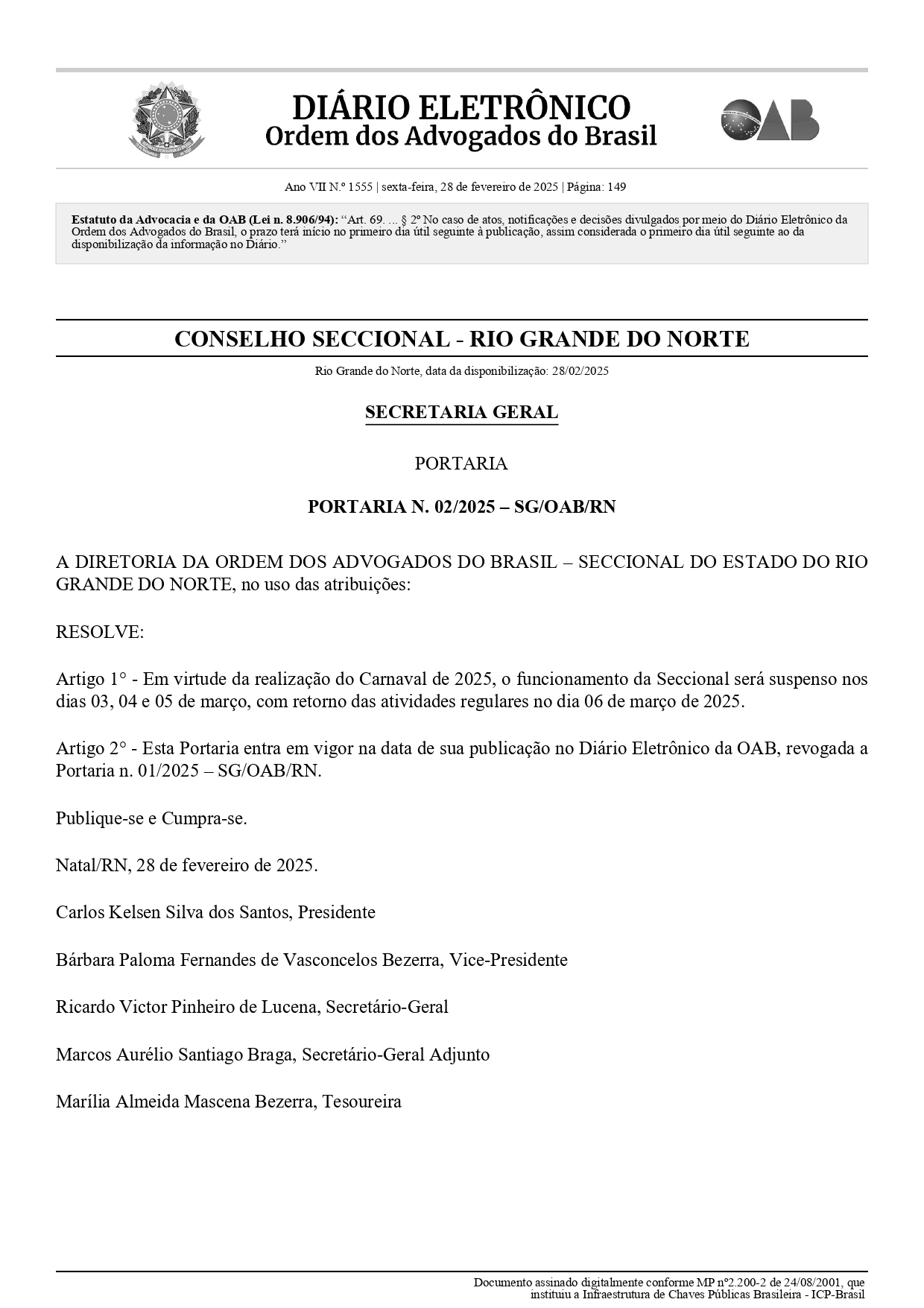 Portaria - OAB/RN Sobre Funcionamento (fechamento) no período do Carnaval