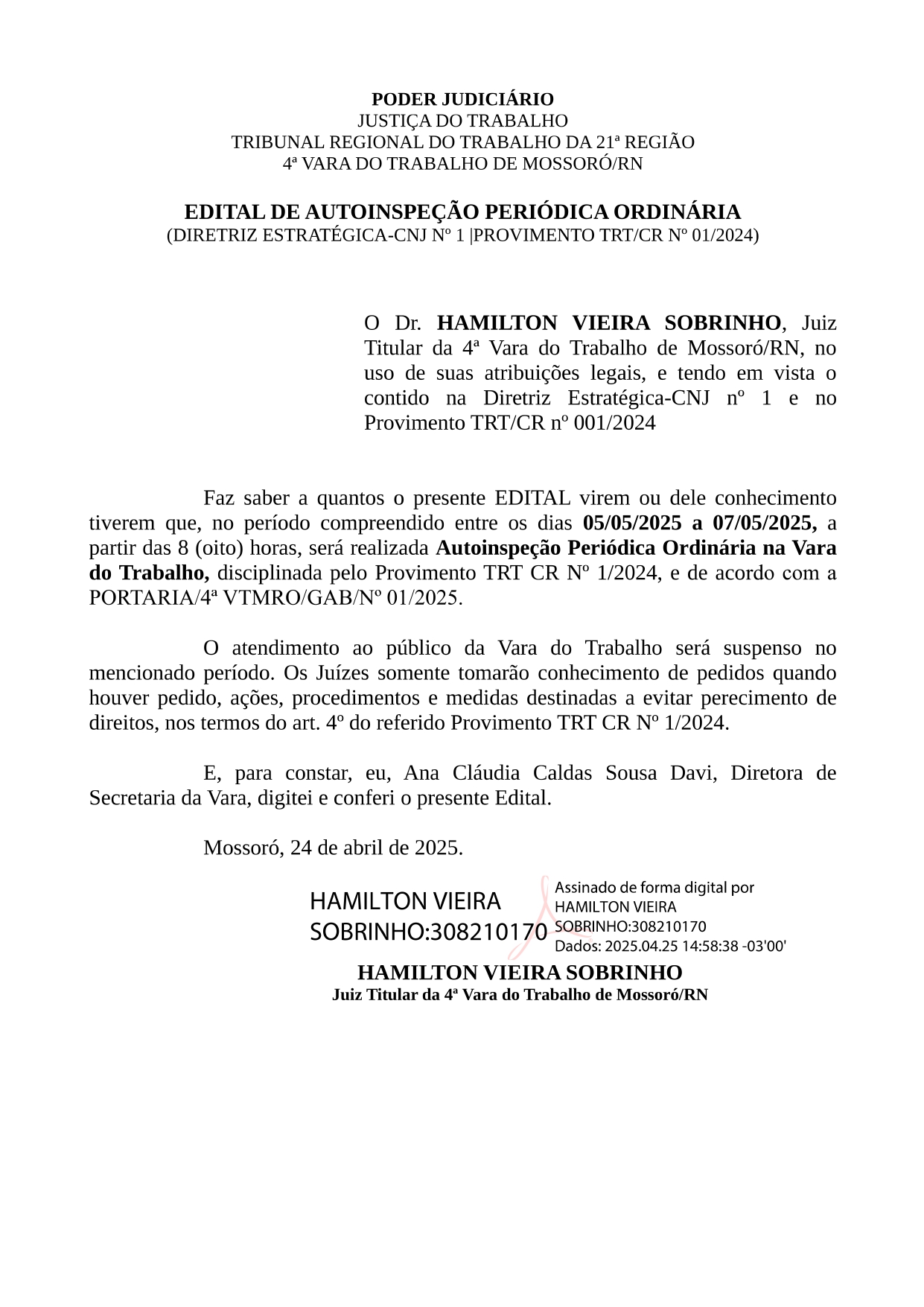 Autoinspeção Periódica Ordinária na Vara do Trabalho - 05 a 07 de maio