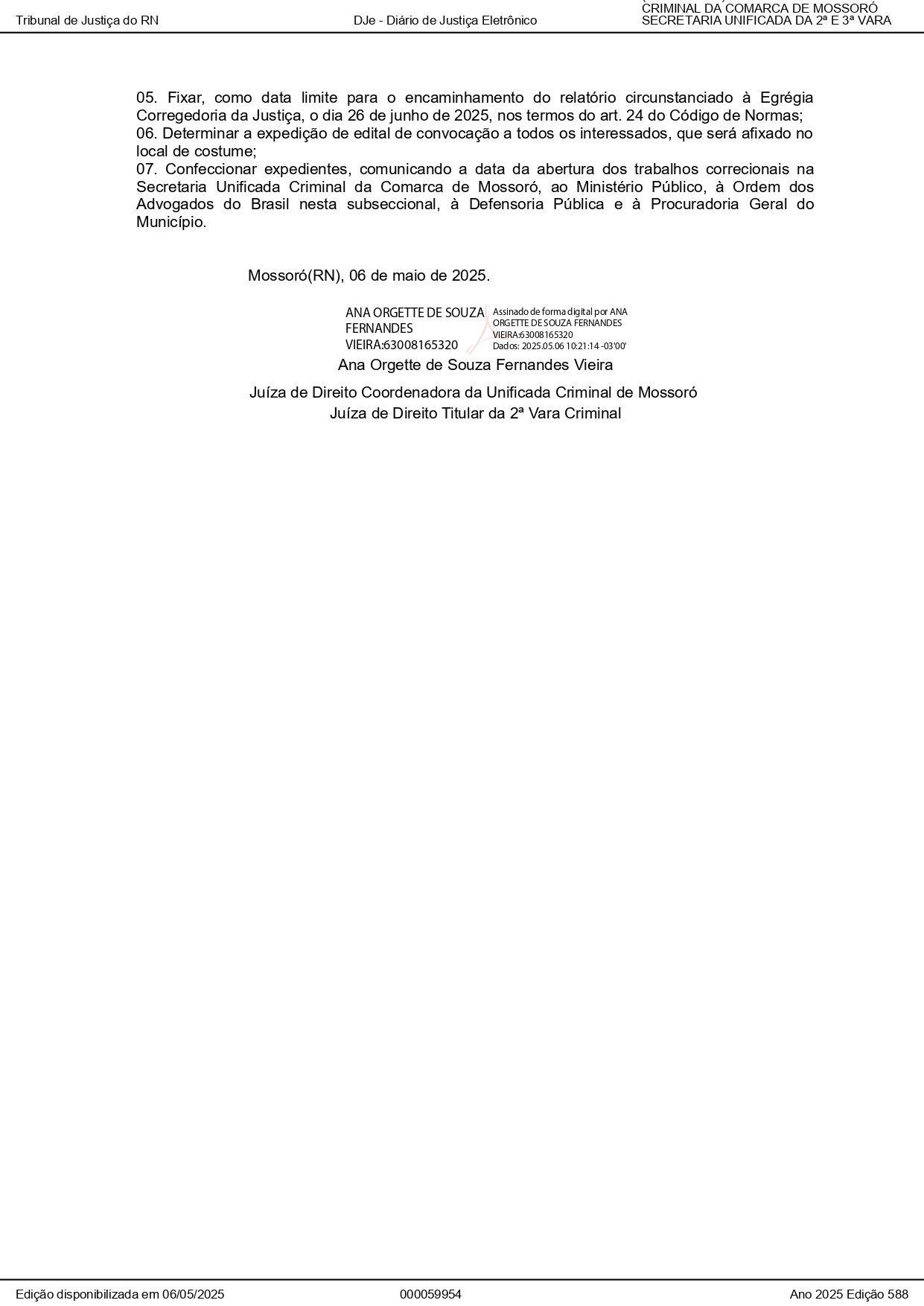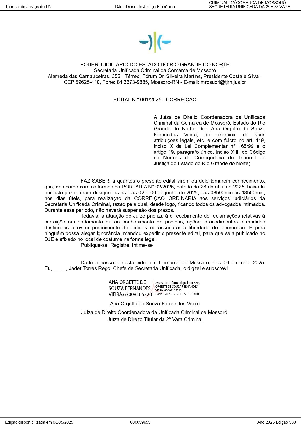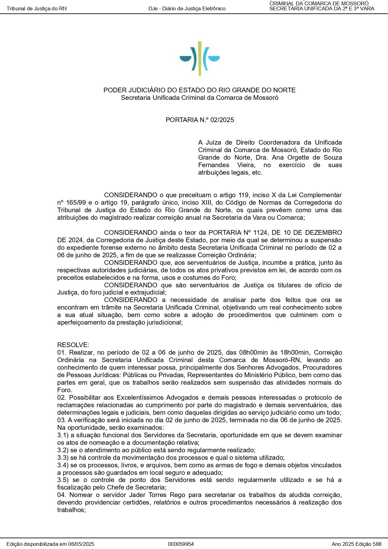 Correição Ordinária - 02 a 06 de Junho de 2025 na Secretaria Unificada Criminal