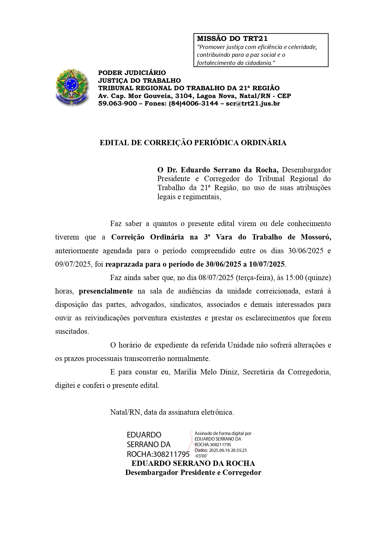Edital de reaprazamento da Correição 3ª Vara do Trabalho de Mossoró