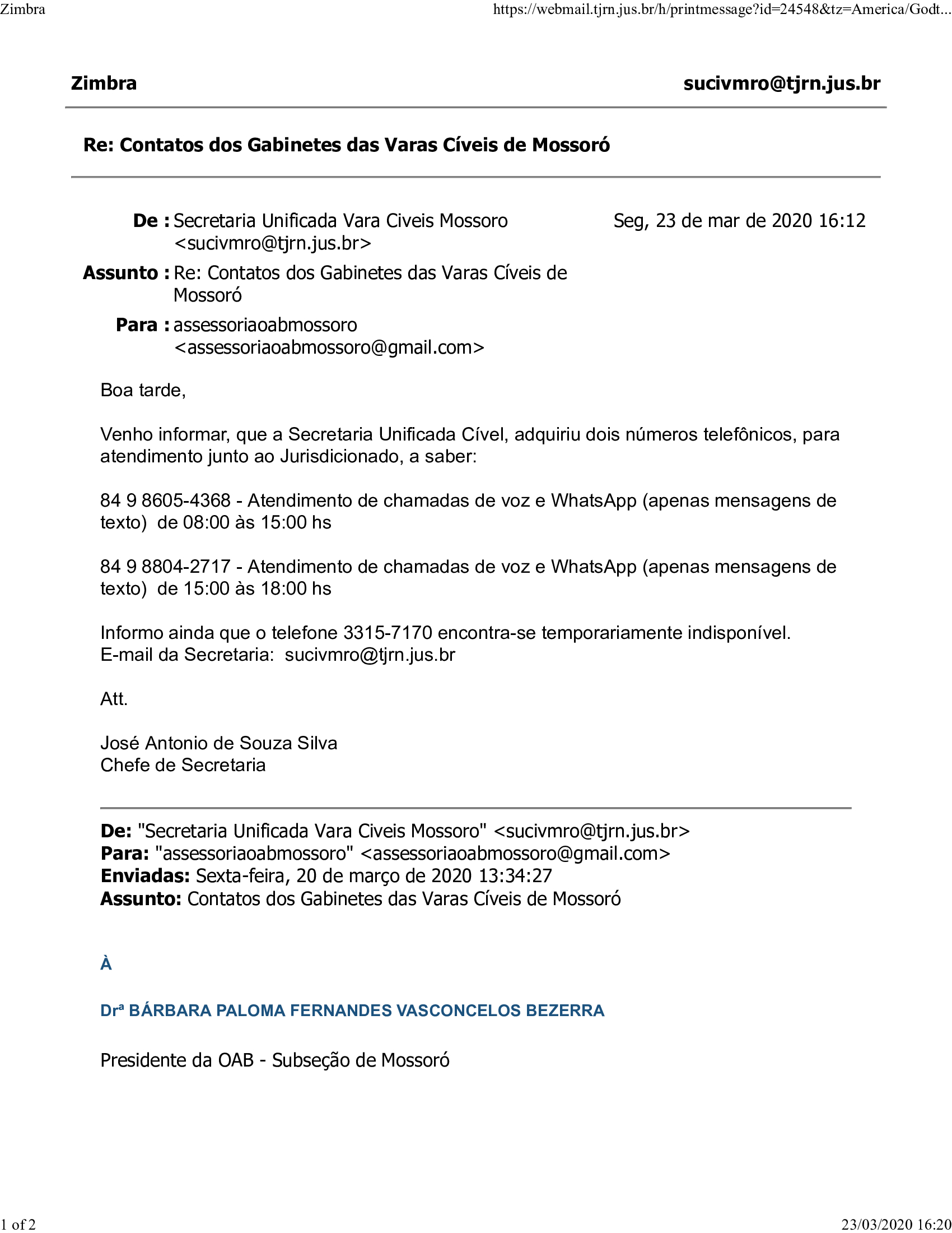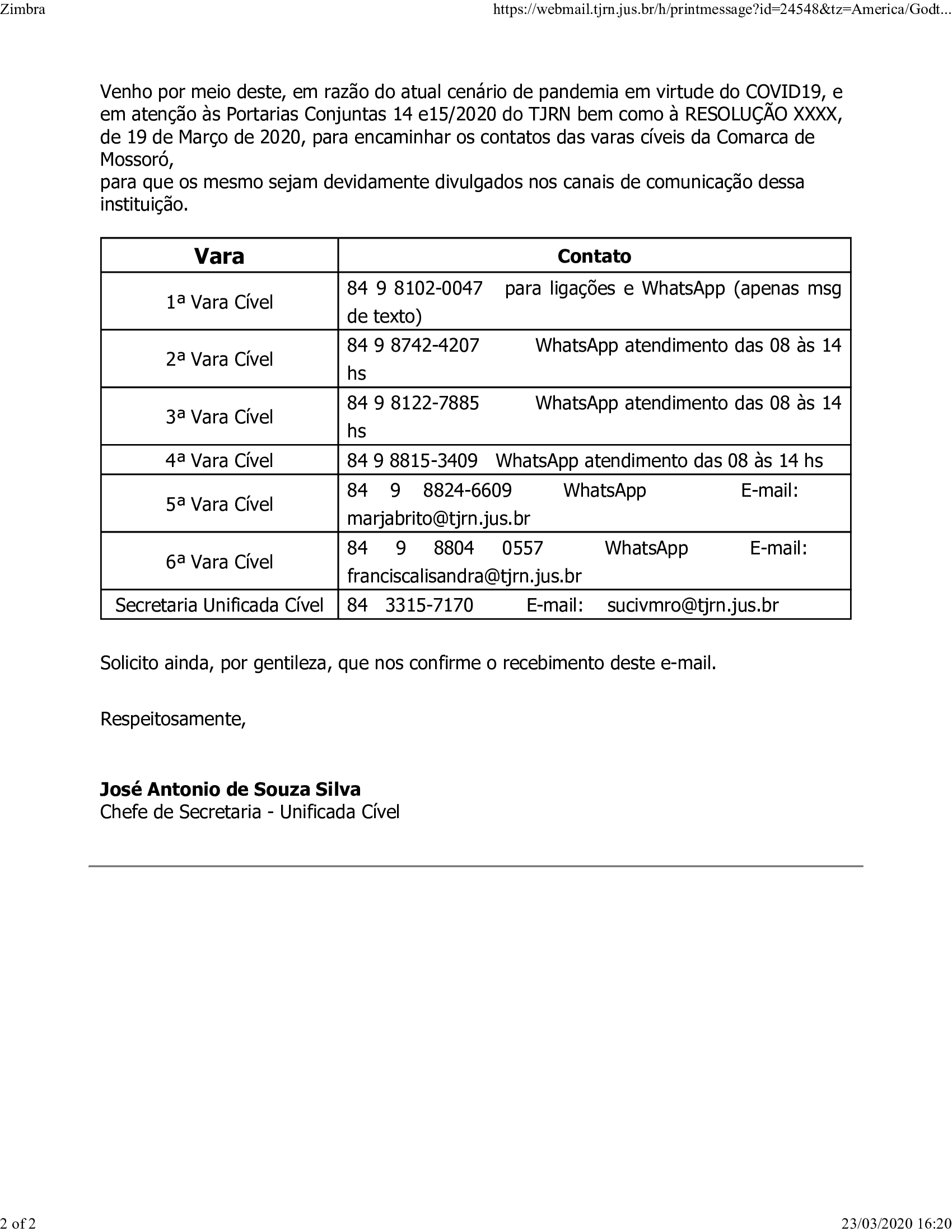 Contatos dos Gabinetes das Varas Cíveis de Mossoró