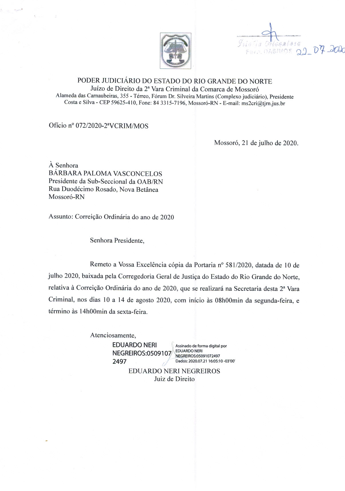 CORREIÇÃO - 2 VARA CRIMINAL COMARCA DE MOSSORÓ