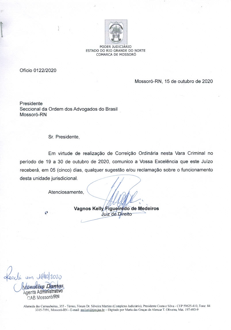 Correição na Vara Criminal da Comarca de Mossoró de 19 a 30 de outubro de 2020.