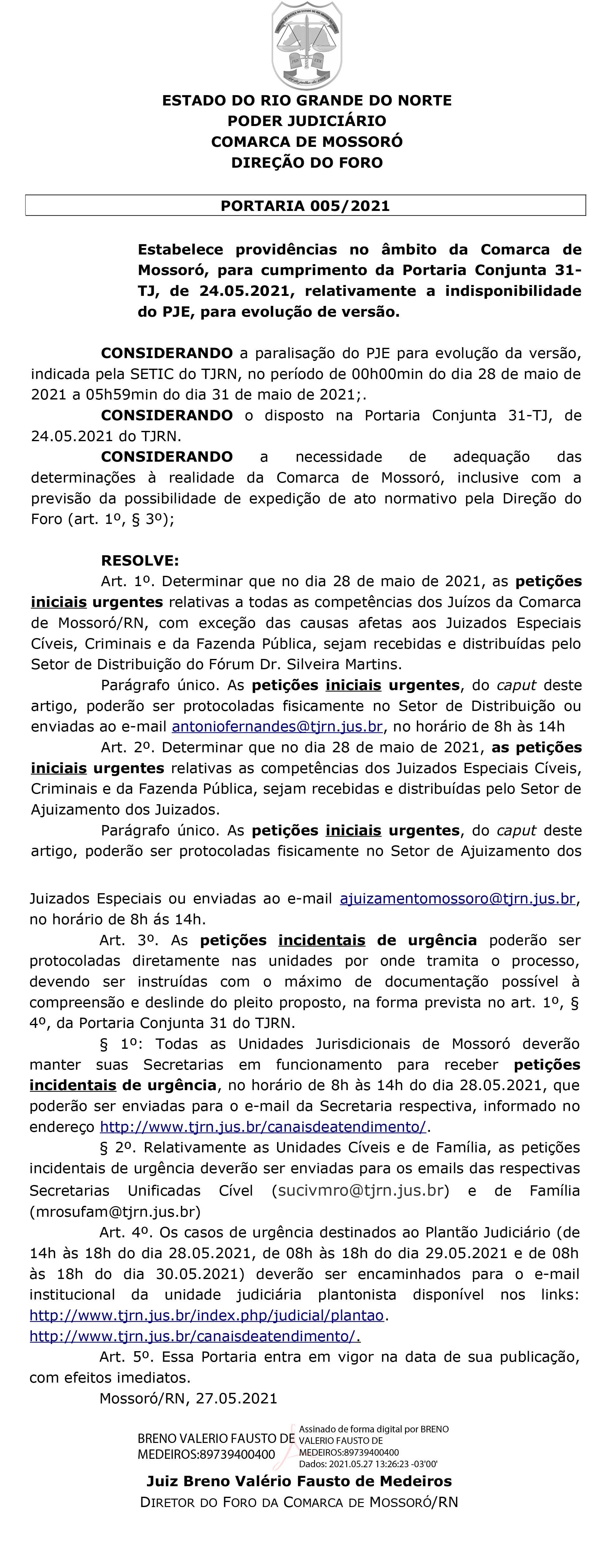 Indisponibilidade do PJE - PORTARIA 005/2021