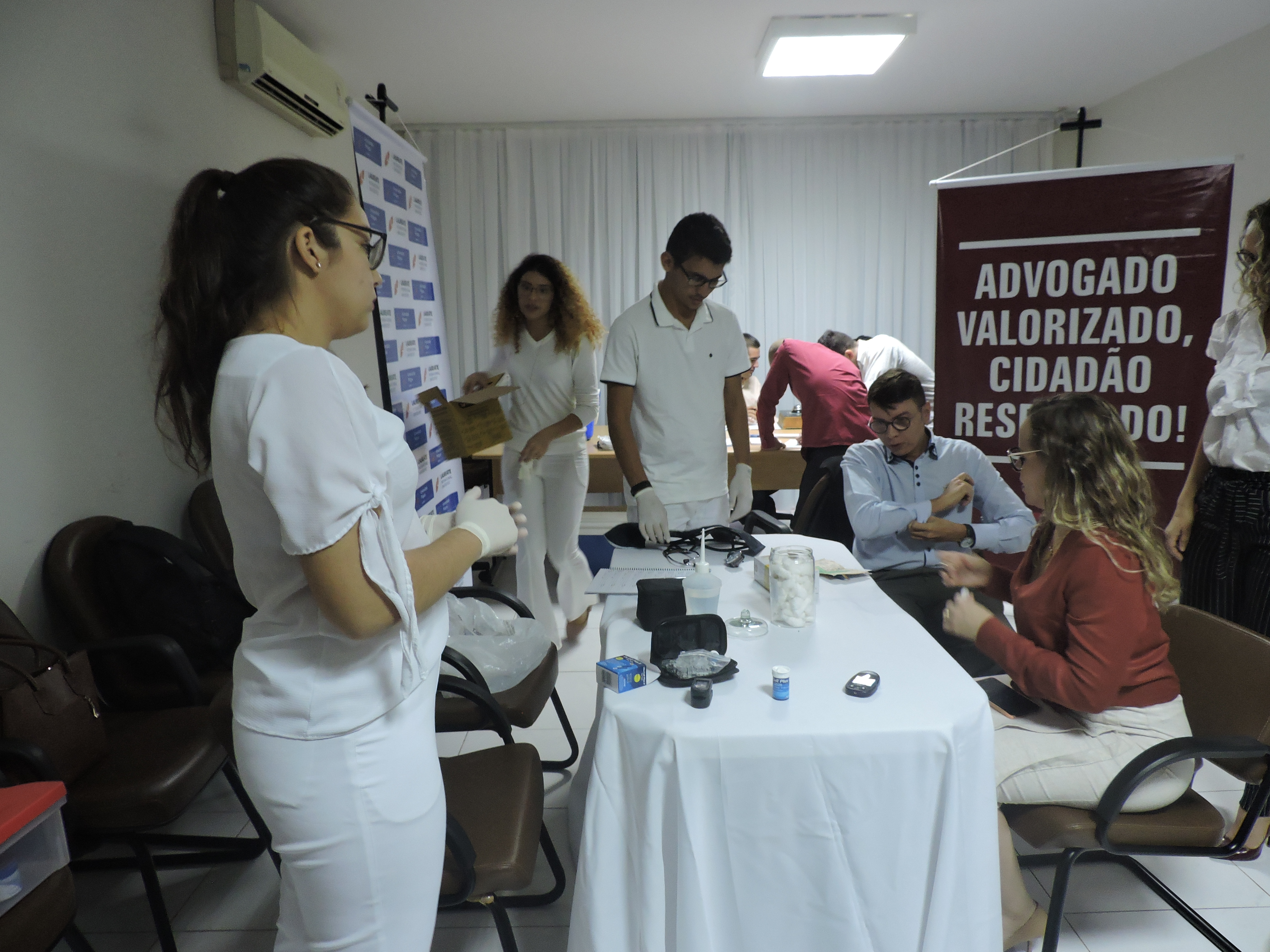 Houve também atendimento de estudantes e enfermeiros da Clínica da Saúde da Universidade Potiguar com a aferição de pressão arterial, testes de Glicemia e vacinação, gratuitamente para os advogados e advogadas presentes.