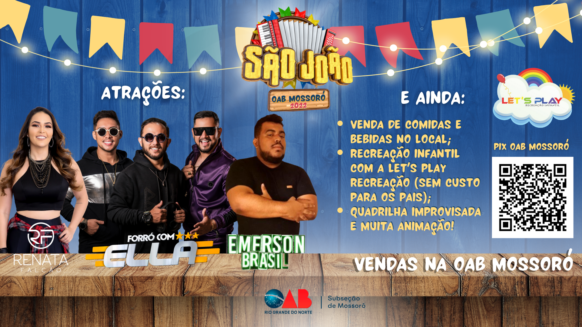 Guarde o paletó e tire o xadrez do armário, porque teremos muita animação com 3 atrações musicais que já prometeram que o arraiá da advocacia será inesquecível! A festa ficará por conta de Renata Falcão, Forró com Ella e Emerson Brasil.