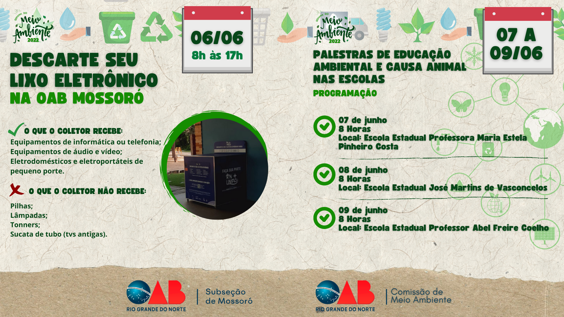 Com o objetivo de ressaltar a importância da preservação ambiental, no dia 06 de junho, segunda-feira, a OAB Mossoró recebe o coletor de lixo eletrônico da Gerência de Meio Ambiente da Prefeitura de Mossoró, e todos estão convidados a descartar corretamente seu lixo eletrônico na sede da Subseccional. O coletor ficará na OAB das 8h às 17h.
