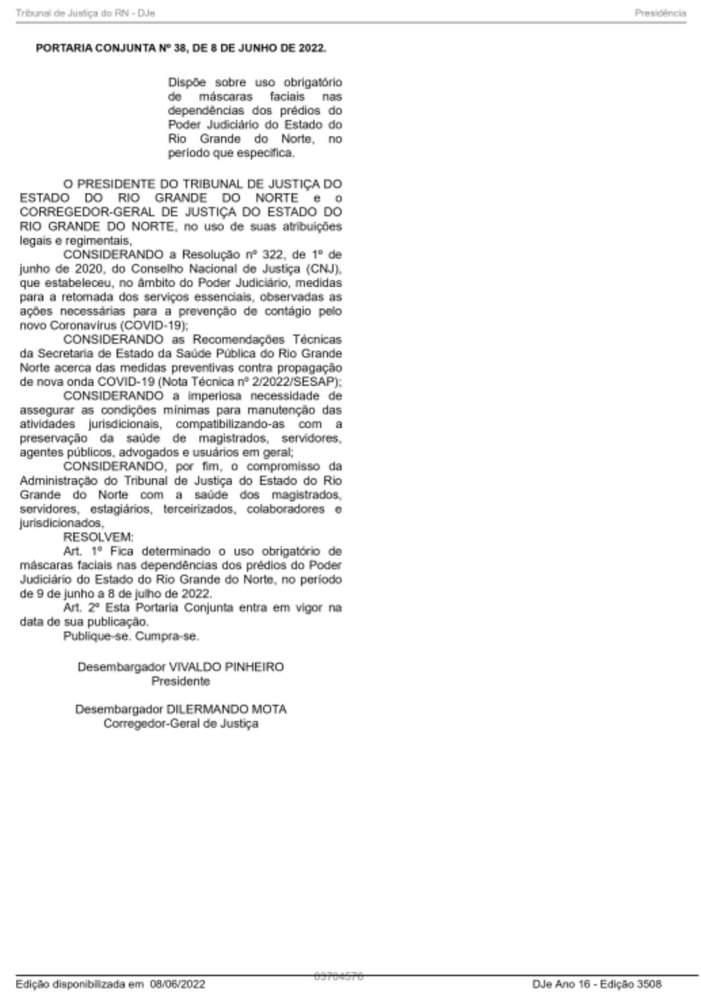 CONSIDERANDO AS RECOMENDAÇÕES DA SECRETARIA DE ESTADO DE SAÚDE PÚBLICA DO RN,DIANTE DO AUMENTO DE CASOS DE COVID-19, O TJRN PUBLICOU A PORTARIA DE NÚMERO 38, ESTABELECENDO O RETORNO DO USO DE MÁSCARA FACIAL EM TODOS OS PRÉDIOS DO PODER JUDICIÁRIO NO RN.