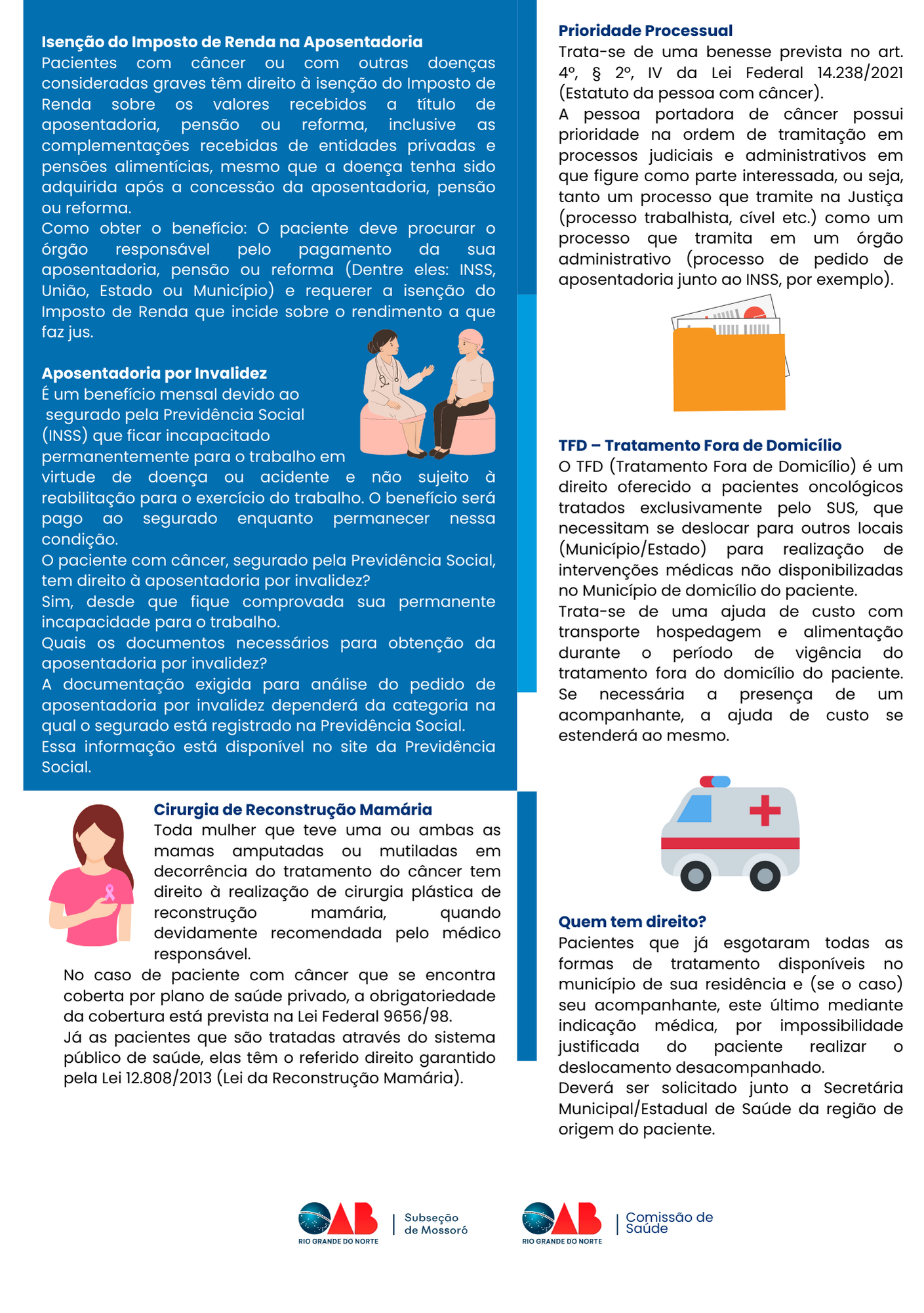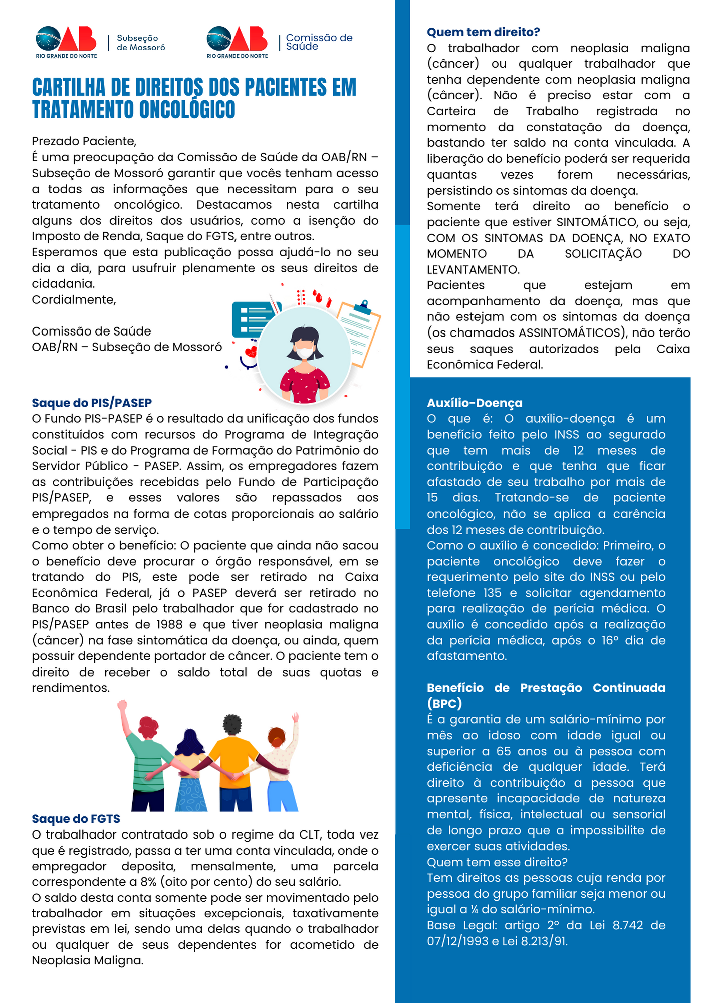 A Comissão preparou uma cartilha, que está sendo distribuída nas rodas de conversa e também ficará disponível no site da OAB Mossoró para todos que tiverem interesse em sanar algumas dúvidas relacionadas aos direitos dos pacientes em tratamento oncológico.