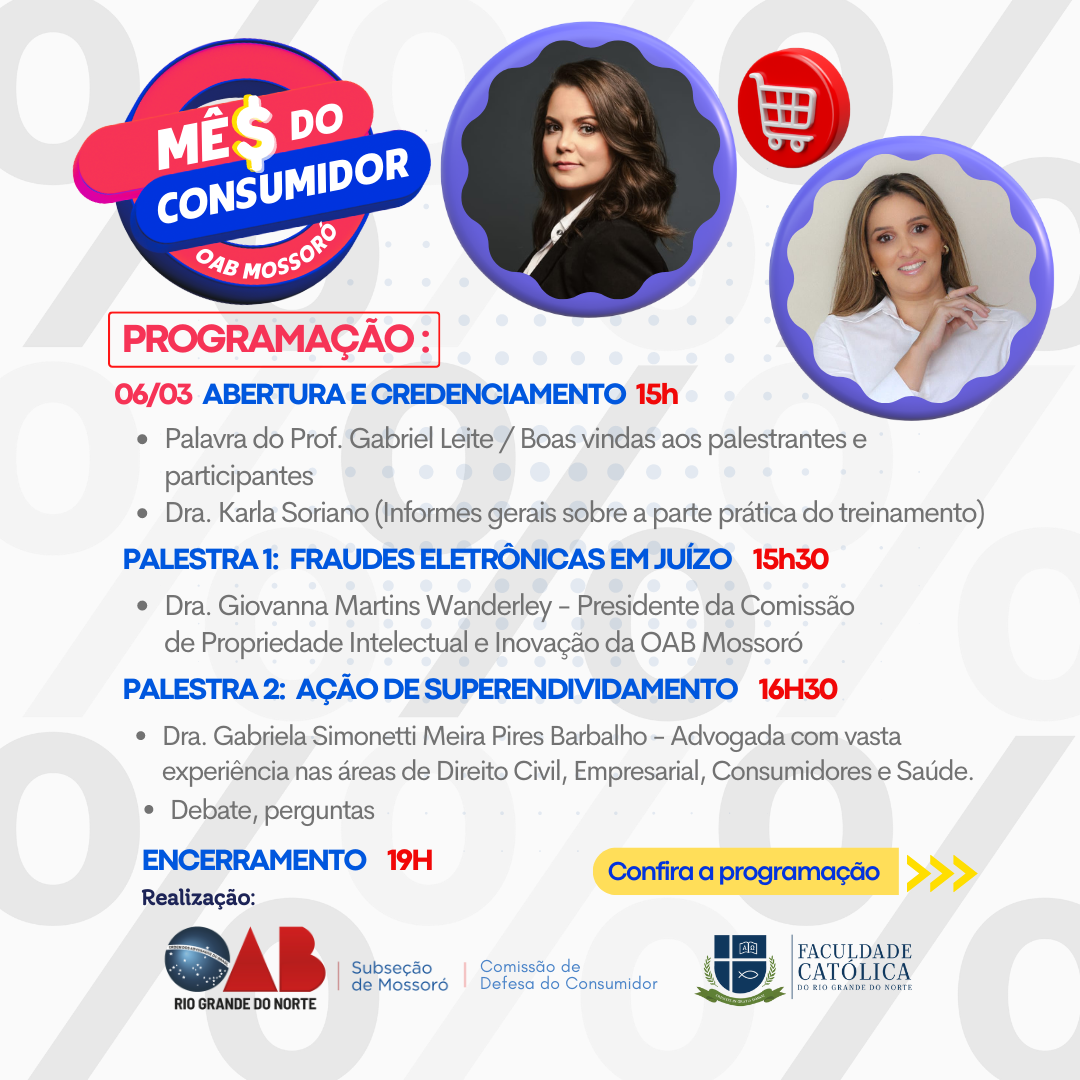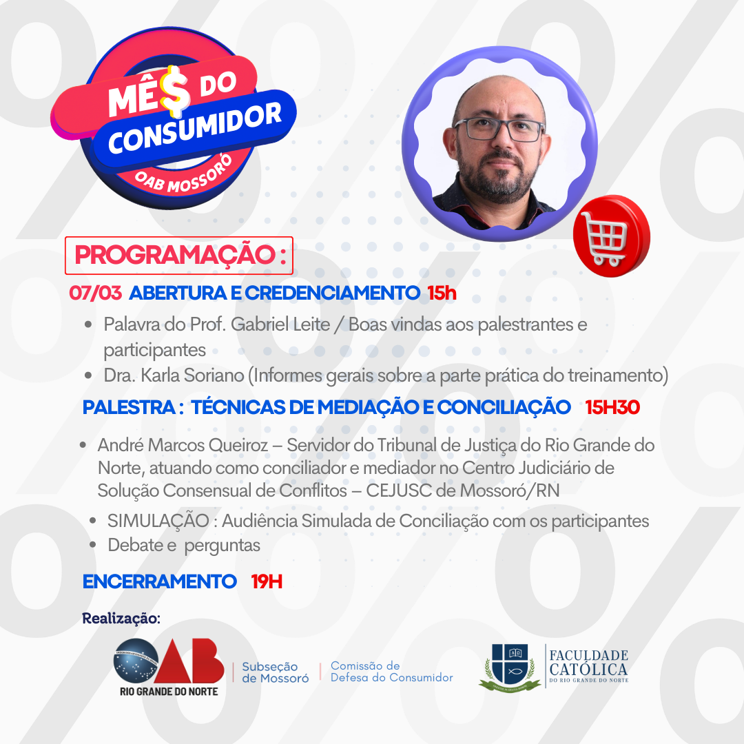 Em alusão ao mês dedicado ao Consumidor a OAB Subseção de Mossoró, através da Comissão de Defesa do Consumidor, realiza em parceria com a Faculdade Católica do RN, o treinamento presencial com o tema 'O tratamento do consumidor superindividado', nos dias 06 e 07 de março deste ano, das 15h às 19h, no Auditório da OAB Mossoró.