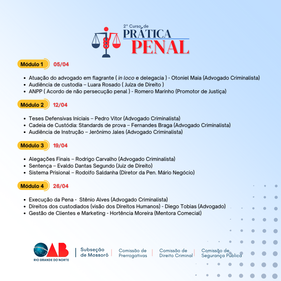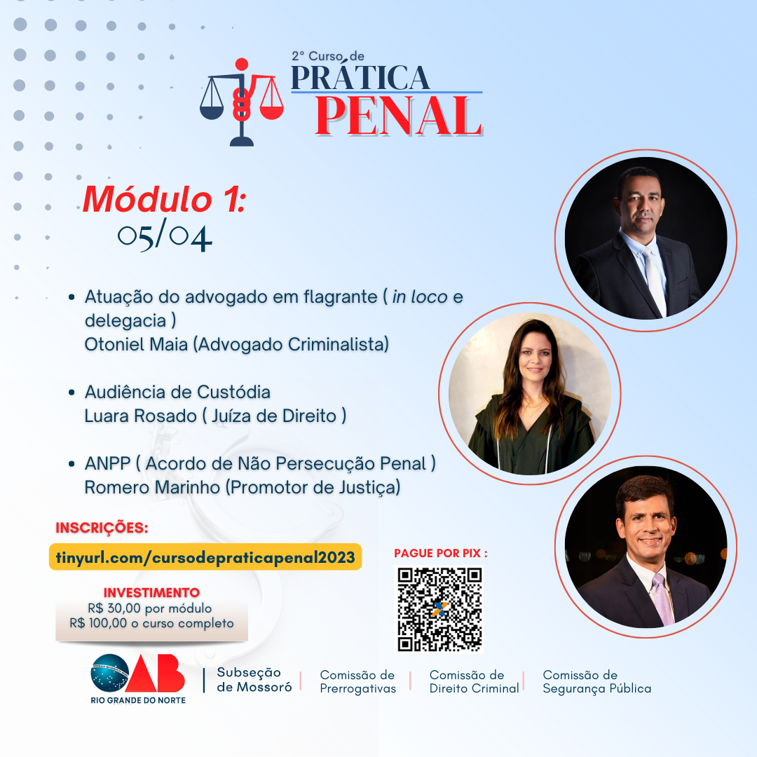 As comissões de Prerrogativas, Segurança Pública e Direito Penal da OAB Subseção de Mossoró realizam o II Curso de Prática Penal, a partir d o dia 05 abril de 2023.