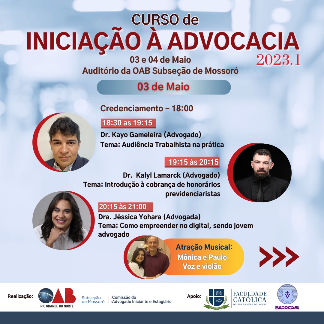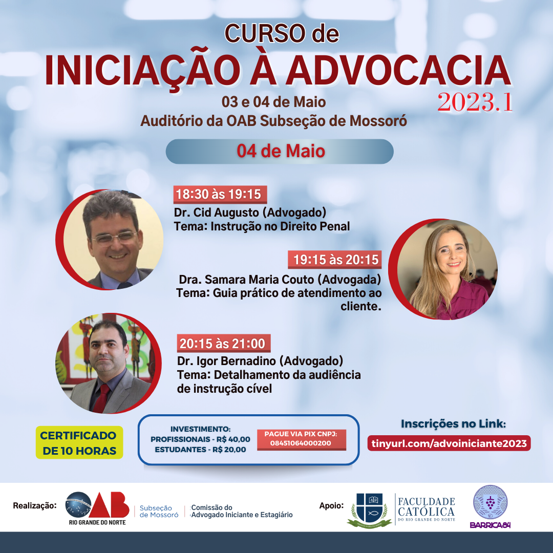 A comissão de Apoio ao Advogado Iniciante da OAB Subseção Mossoró, realiza o Curso de Iniciação à Advocacia 2023.1, nos dias 03 e 04 de maio.
