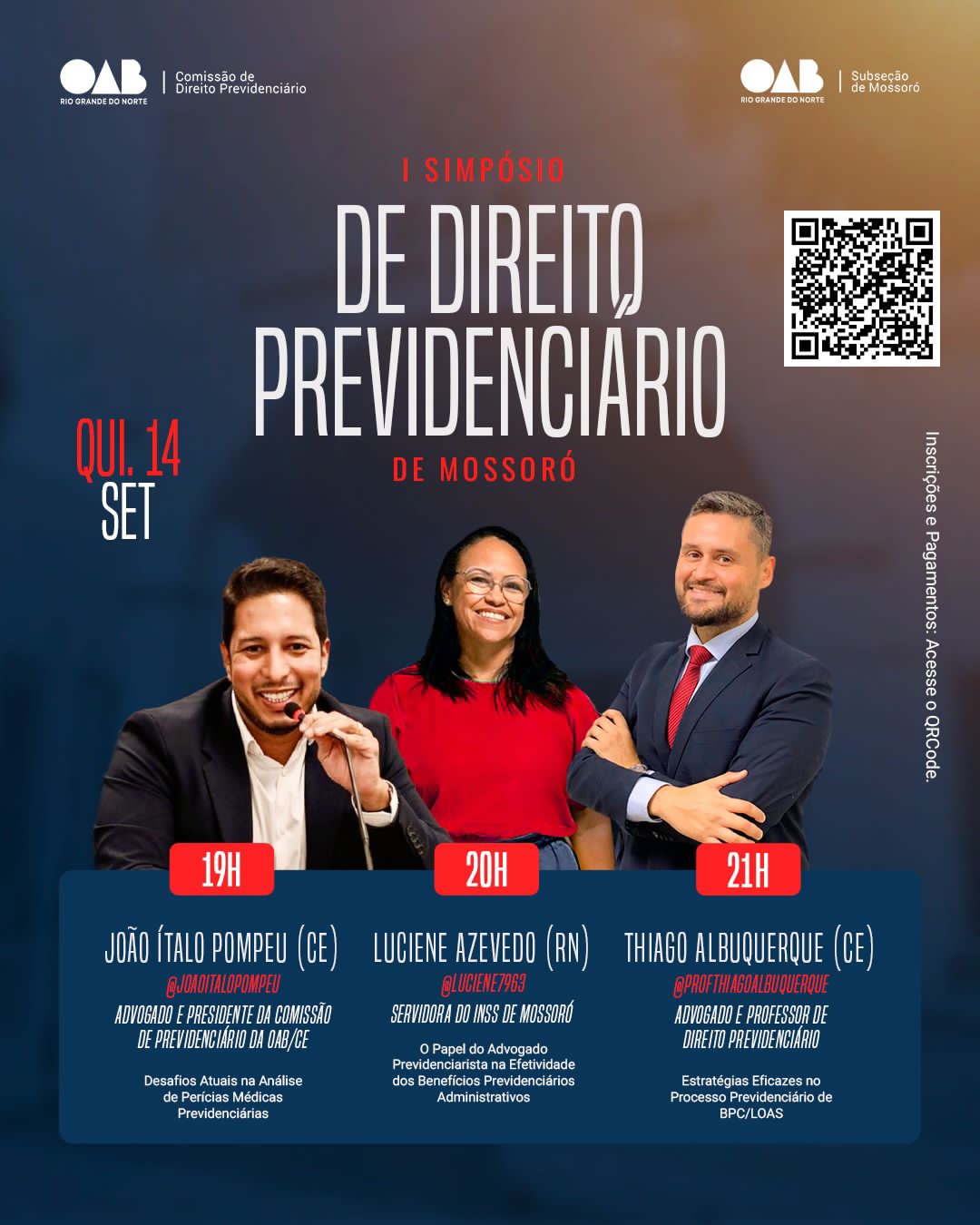 O I Simpósio de Direito Previdenciário de Mossoró é uma ação educativa organizada pela Comissão de Direito Previdenciário & Assistência Social da OAB Mossoró. O evento se realizará no auditório da OAB Mossoró nos dias 14 e 15 de setembro, a partir das 19h.