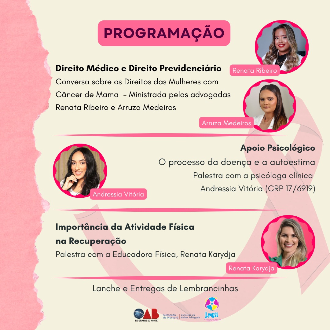 A Comissão da Mulher Advogada em parceria com a Liga Mossoroense de Estudos e Combate ao Câncer de Mossoró e Região - LMECC, preparou para o próximo dia 25 de outubro, às 9h no Centro de Oncologia, um evento especial dedicado às mulheres que estão enfrentando o câncer de mama neste mês do #outubrorosa.
