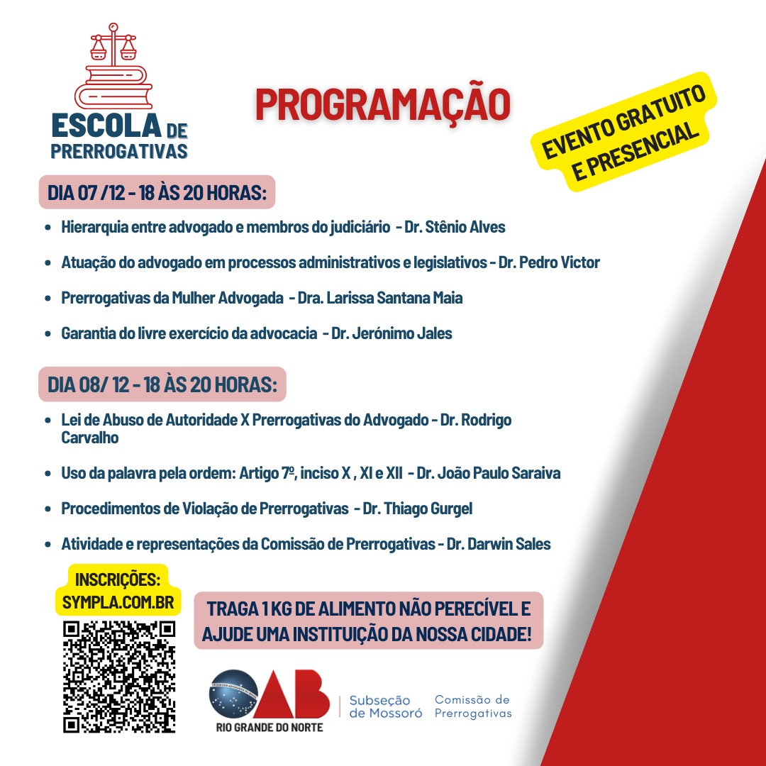 A Comissão de Prerrogativas da OAB Mossoró prepara o primeiro curso da Escola de Prerrogativas, nos dias 07 e 08 de dezembro de 2023, das 18h às 20h, no auditório da sede, com intuito de fomentar o conhecimento e atualização jurídica das advogadas e dos advogados, especialmente os membros que entram na Ordem.