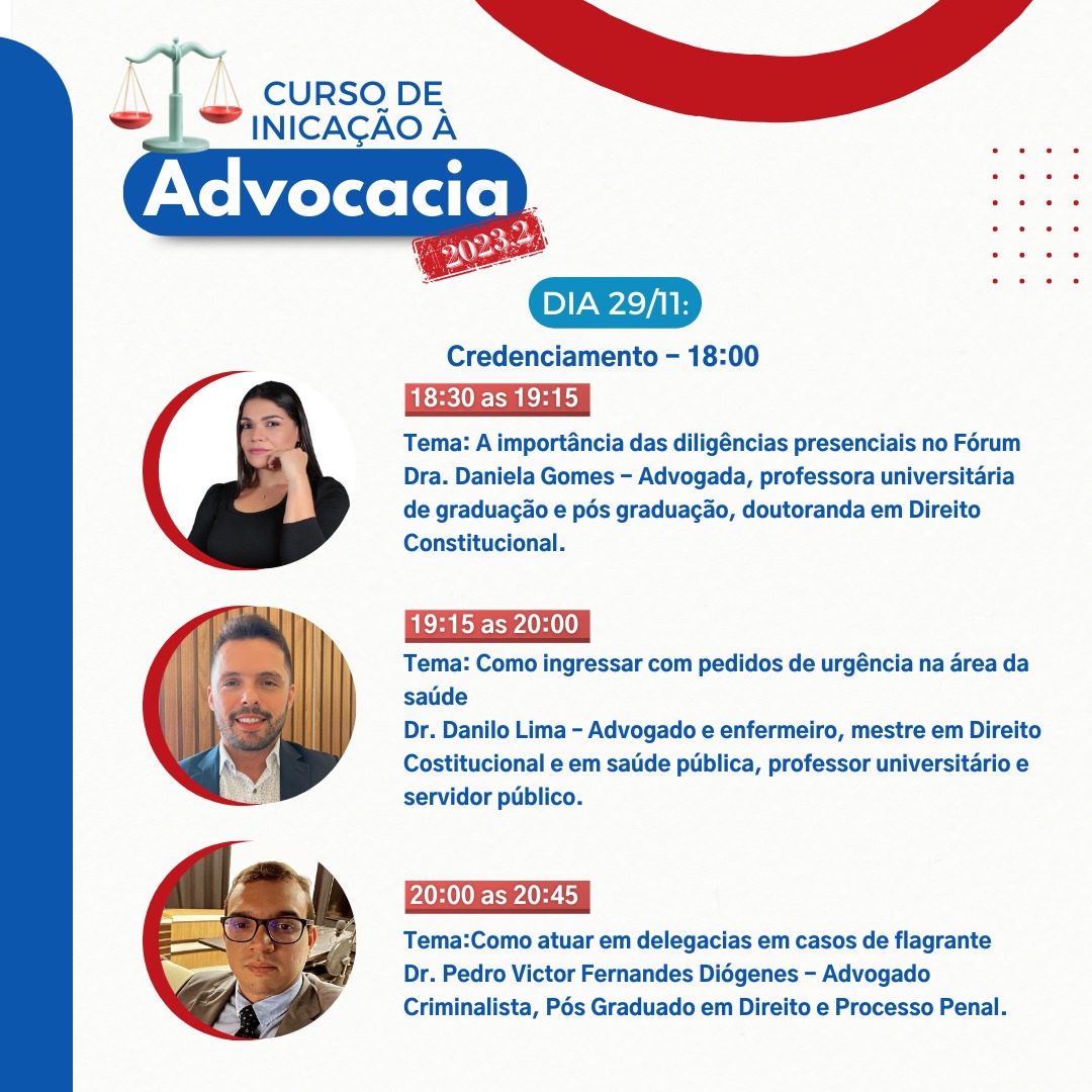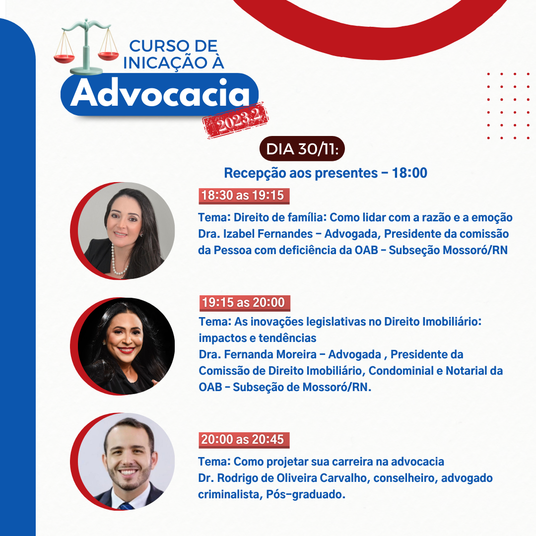 A comissão de Apoio ao Advogado Iniciante da OAB Subseção Mossoró, realiza o Curso de Iniciação à Advocacia 2023.2, nos dias 29 e 30 de novembro.