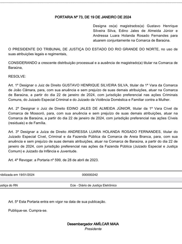 O TJRN acatou o pedido e publicou portaria No 73 do último dia 19 de janeiro de 2024 nomeando para atender a Comarca de Baraúna mais dois juízes, sendo um da Comarca de Mossoró, Edino Jales de Almeida Júnior, e outra da Comarca de Areia Branca, a juíza, Andressa Luara Holanda Rosado Fernandes que estão mais próximas de Baraúna, mantendo também o juiz de João Câmara, Gustavo Henrique Silveira Silva, elevando assim para três o número de juízes à disposição: