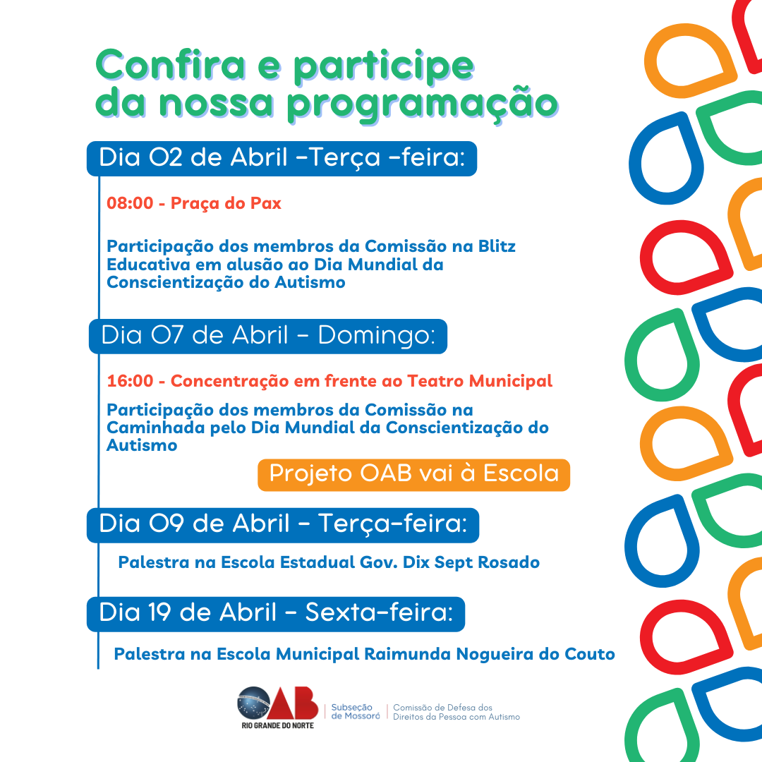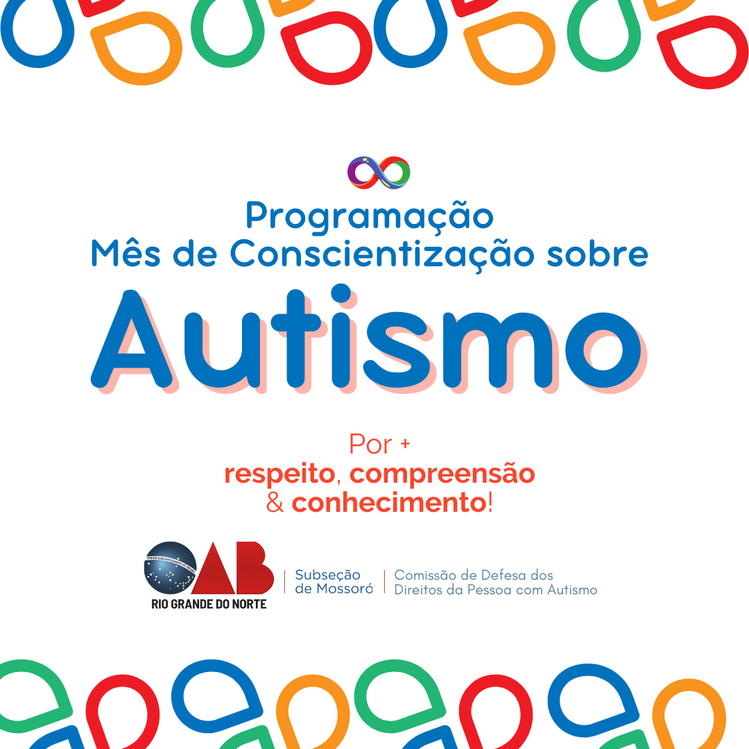 A Comissão de Defesa dos Direitos da Pessoa com Autismo da OAB Subseção de Mossoró divulga a programação referente ao mês Azul, com uma série de atividades em abril, mês em que se celebra o Dia Mundial de Conscientização do Autismo. A data que é o dia 02 de abril foi escolhida pela ONU (Organização das Nações Unidas) desde 2007 e tem sido fundamental para a mobilização da sociedade e das entidades que atuam nessa conscientização, para que hajam avanços, respeito e sobretudo, compreensão sobre as pessoas do espectro autista.