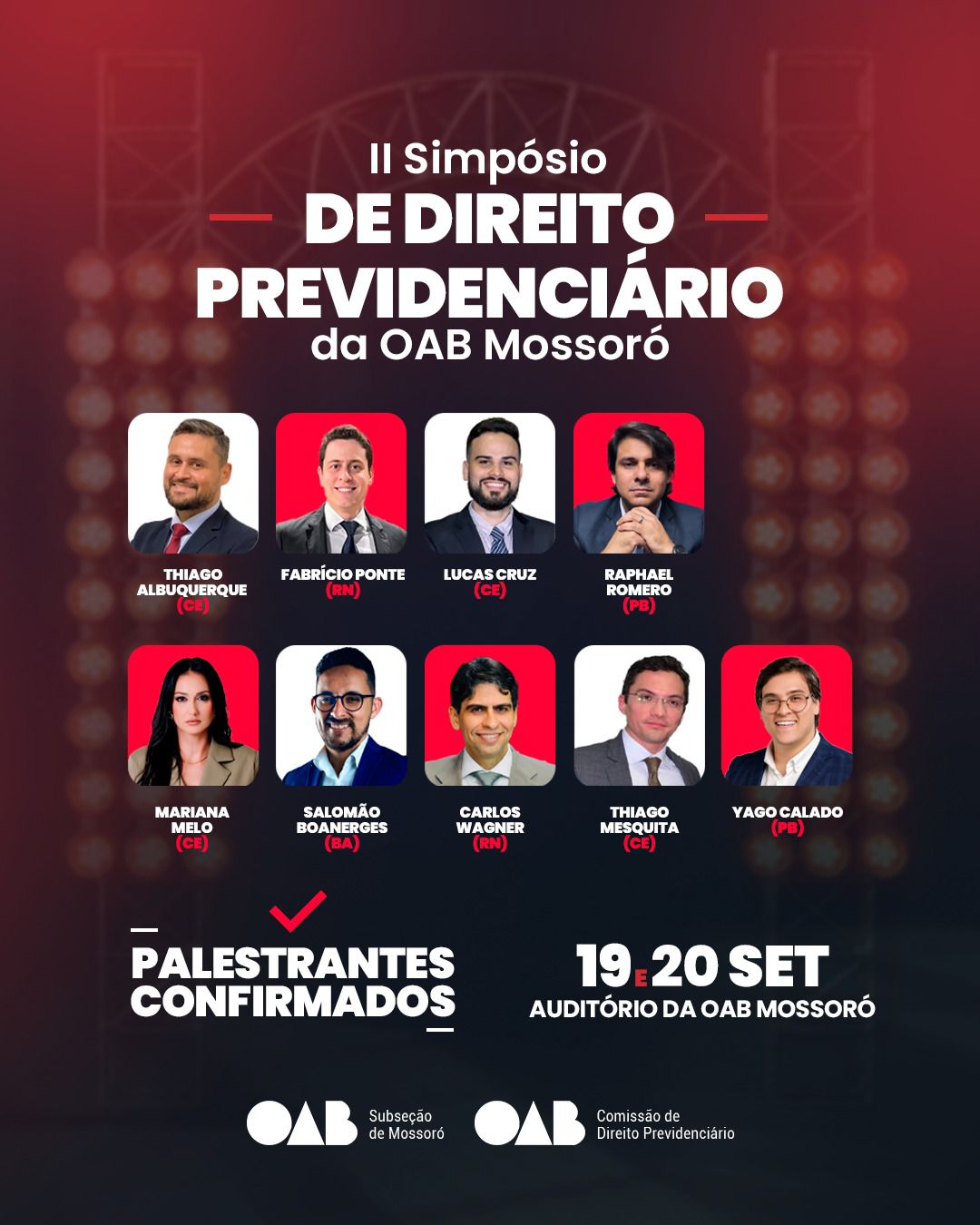No dia seguinte, 20 de setembro, às 18h20, Mariana Melo, cearense especialista em Aposentadorias Especiais, abrirá as palestras com "Detalhando o PPP: As Nuances da Aposentadoria Especial", seguida por Salomão Boanerges às 19h00, que desmembrará o CNIS no contexto previdenciário.