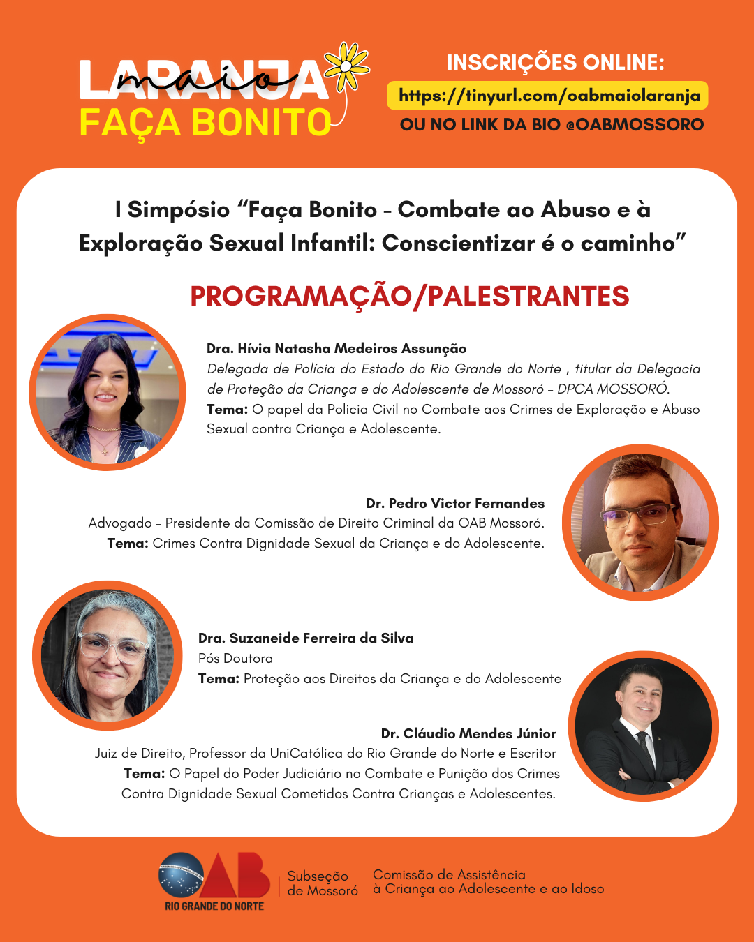 A Comissão de Assistência à Criança, ao Adolescente e ao Idoso da OAB Subseção de Mossoró realizará o I Simpósio “Faça Bonito - Combate ao Abuso e à Exploração Sexual Infantil: Conscientizar é o caminho”, no dia 27 de Maio, às 18h00, no Auditório da OAB Mossoró.