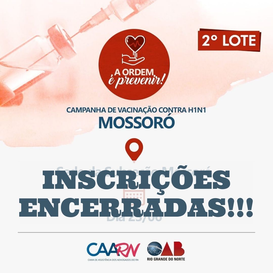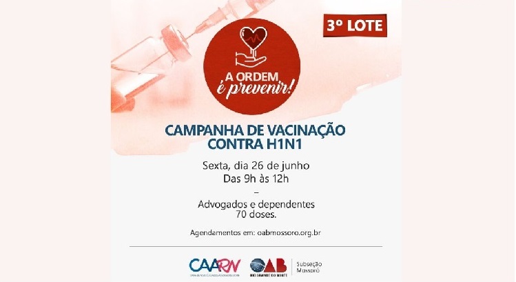 A OAB Mossoró informa que estão encerrados os agendamentos para a vacinação contra a H1N1 que será realizada nesta terça-feira (23), das 9h30 às 17h.