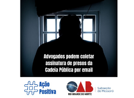 Os advogados não precisarão mais se deslocar até à Cadeia para apenas coletar as assinaturas dos seus clientes. Agora basta enviar a procuração para o email cpmossoro@rn.gov.br e solicitar a coleta da assinatura do cliente.