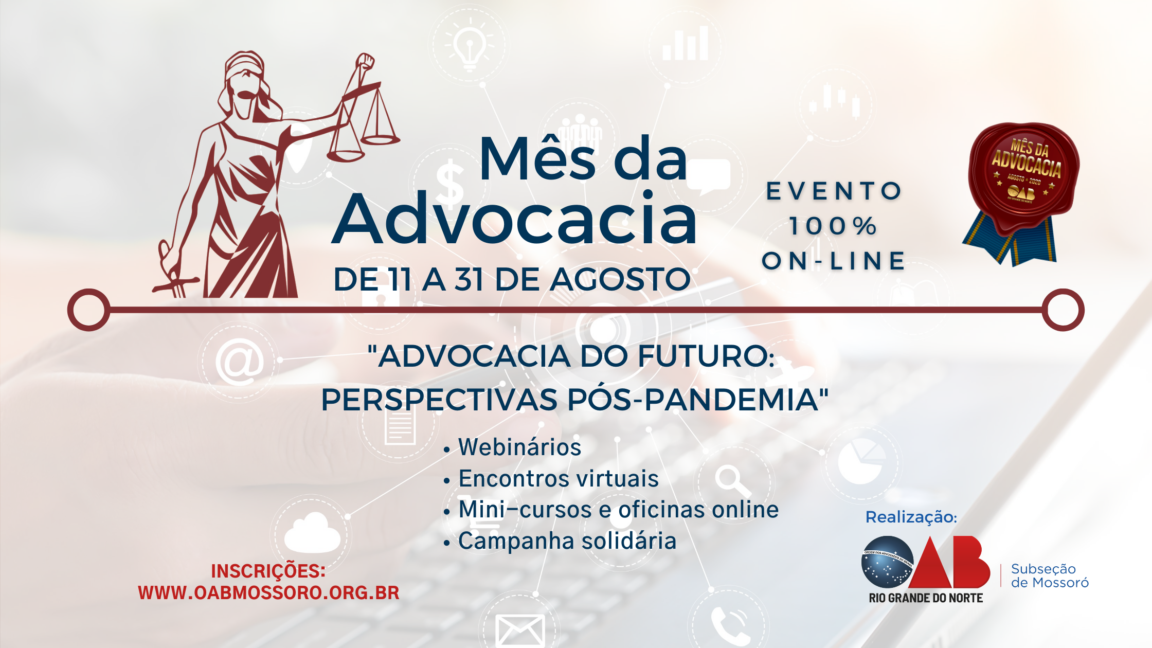 O Mês da Advocacia na OAB Mossoró será 100% digital com minicursos, oficinas, palestras e rodas de bate-papo virtuais. Os eventos serão realizados pela plataforma Zoom e alguns deles transmitidos ao vivo pela redes sociais.
