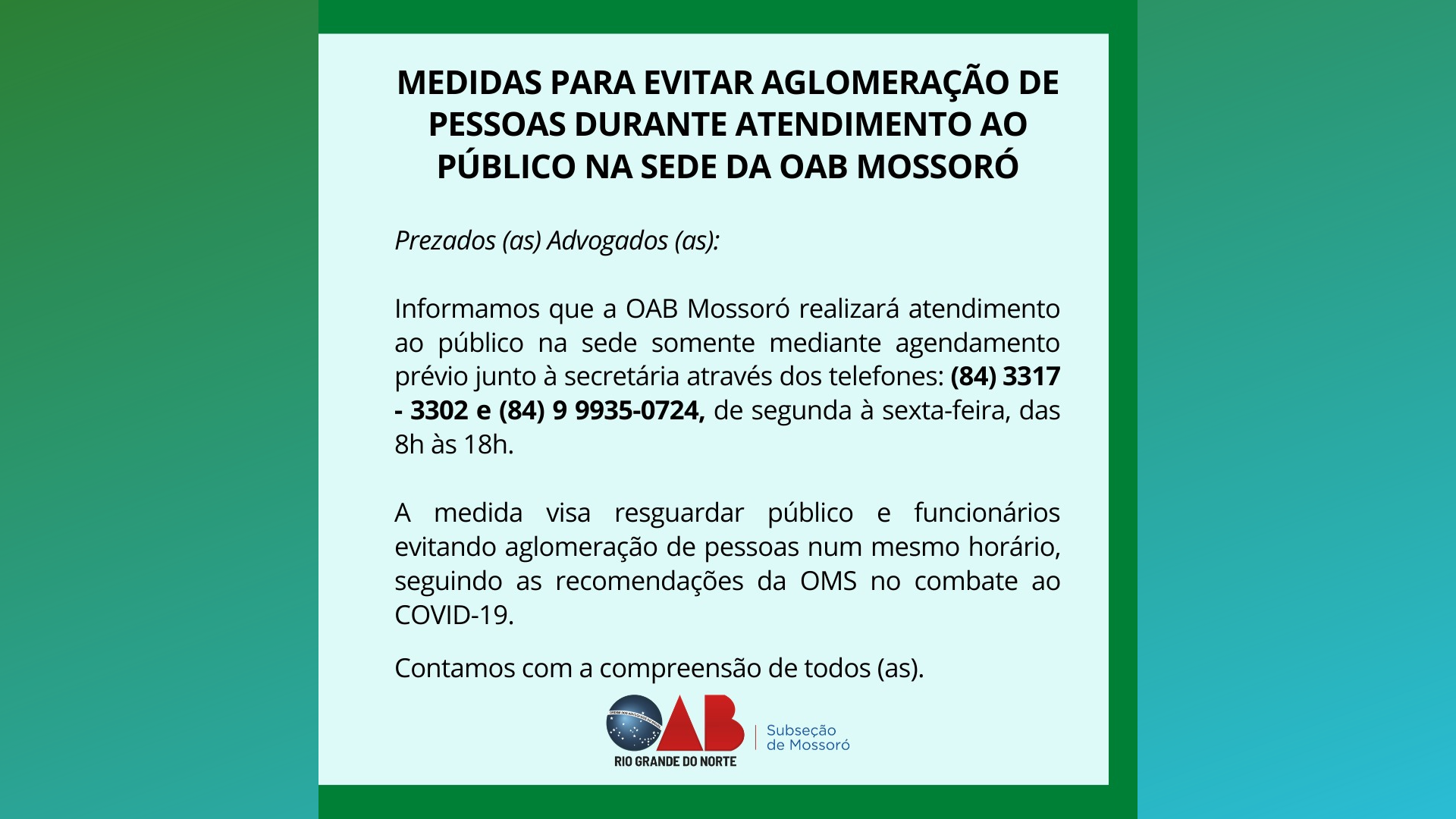 A OAB Mossoró tem acompanhado as ações tanto do Município quanto do Estado e tem cobrado das instituições união de esforços na tarefa de ampliar a fiscalização e reduzir aglomerações de pessoas no comércio local.