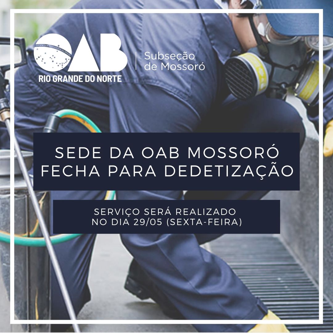 Sede OAB Mossoró vai estar fechada para atendimento nesta sexta (29) por motivo de dedetização. Haverá atendimento remoto por telefone.