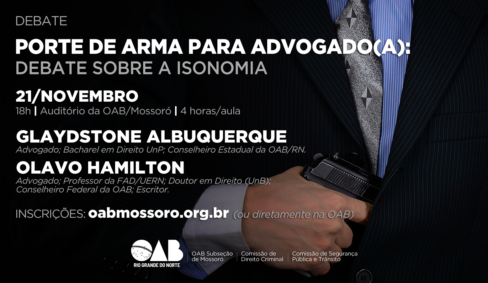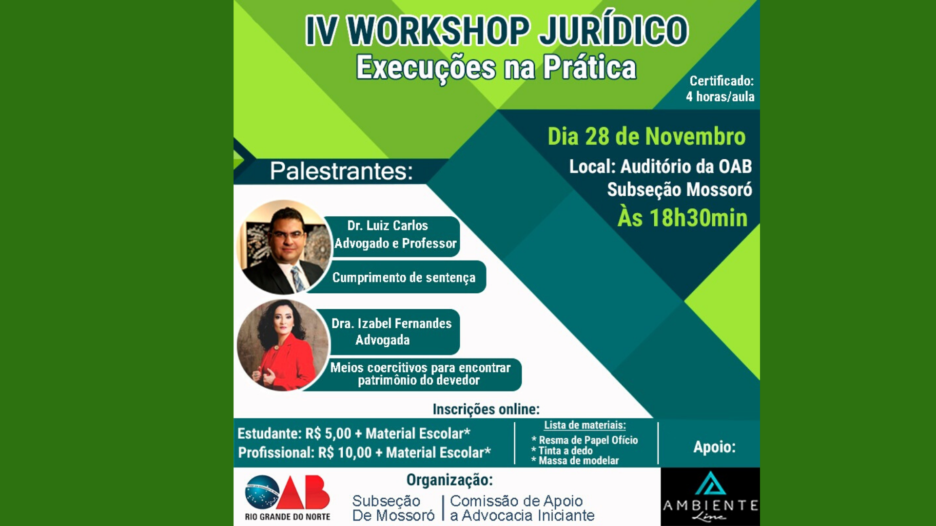 As vagas são limitadas e as inscrições já podem ser feitas online, com pagamento presencialmente na sede da OAB e nas salas dos advogados dos Fóruns (Justiça Federal, Justiça do Trabalho e Fórum Silveira Martins).