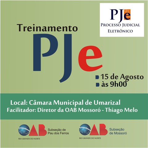 A OAB Subseção de Mossoró e a OAB Subseção de Pau dos Ferros realizarão o treinamento do Processo Jurídico Eletrônico - PJe na cidade de Umarizal.