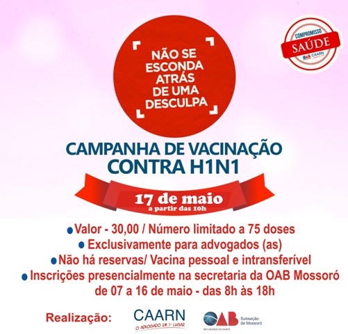 Para ter acesso a vacina, o advogado (a) fará a doação de R$ 30,00 pago de forma presencial, na secretaria da OAB Mossoró, das 8h às 18h, no período de 07 a 16 de maio.